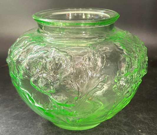260408-19 Tiffin Green Uranium Glass Poppy Embossed Vase