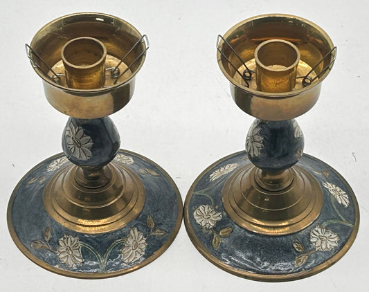 260408-37 Pair Enameled Brass Candlestick Holders