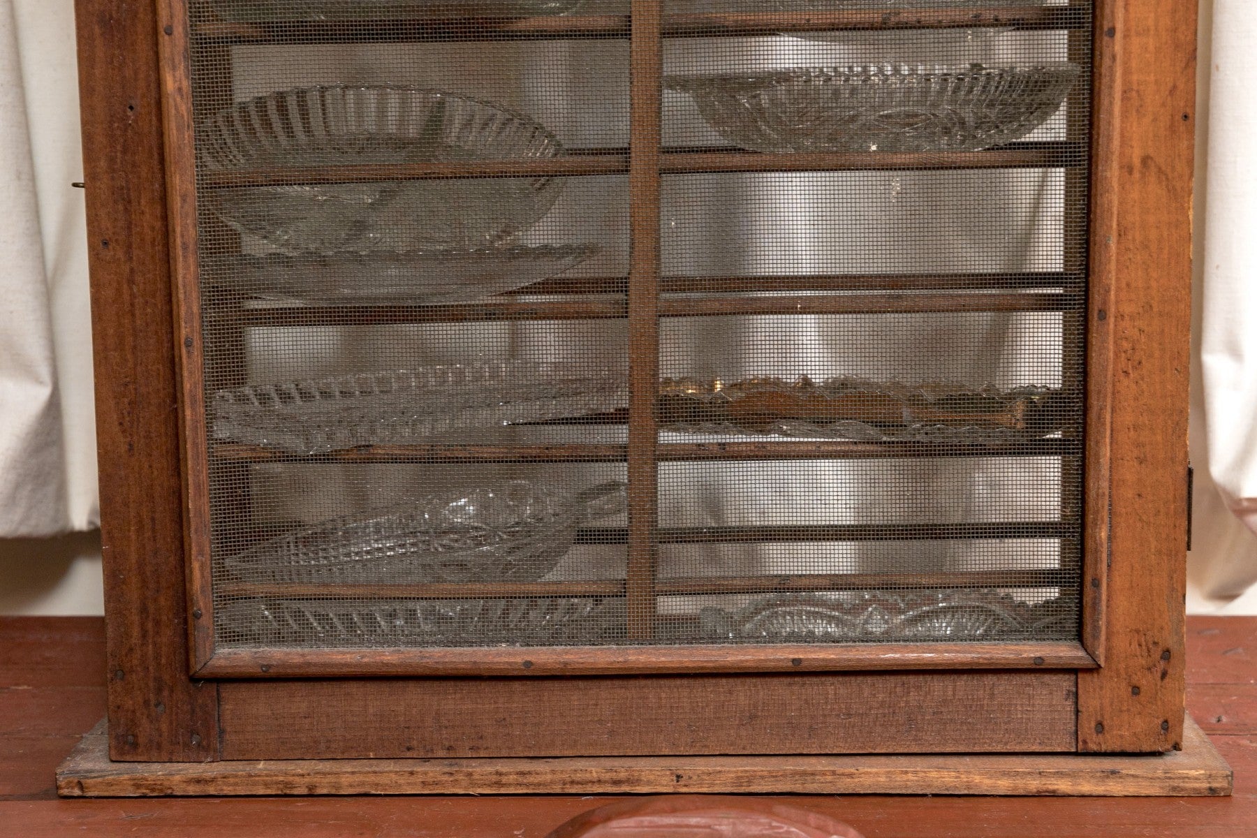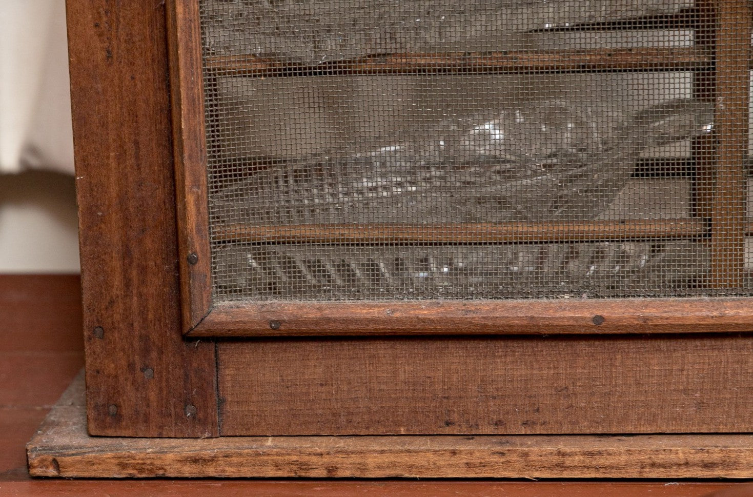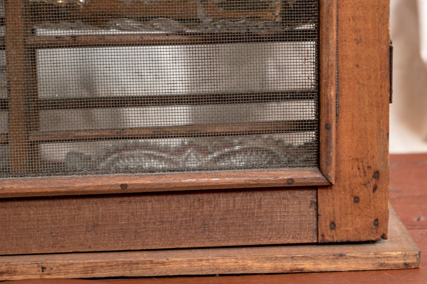 Early 20th century tabletop pie safe. Having a pine frame with wire mesh paneling and door that opens to reveal simple cylindrical cooling racks.