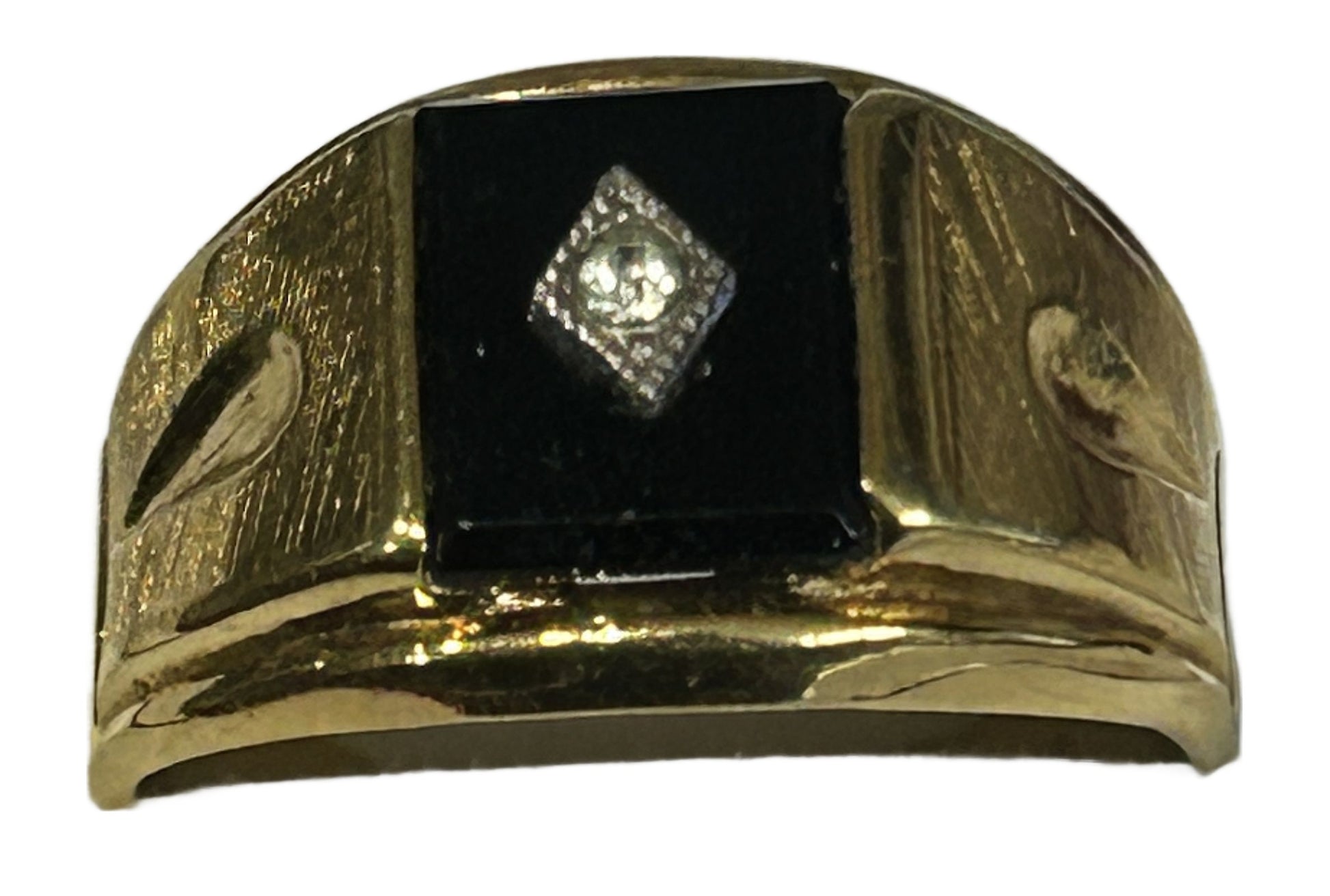 Men's size 9 18k yellow gold ring with old mine cut diamond centered in black onyx.