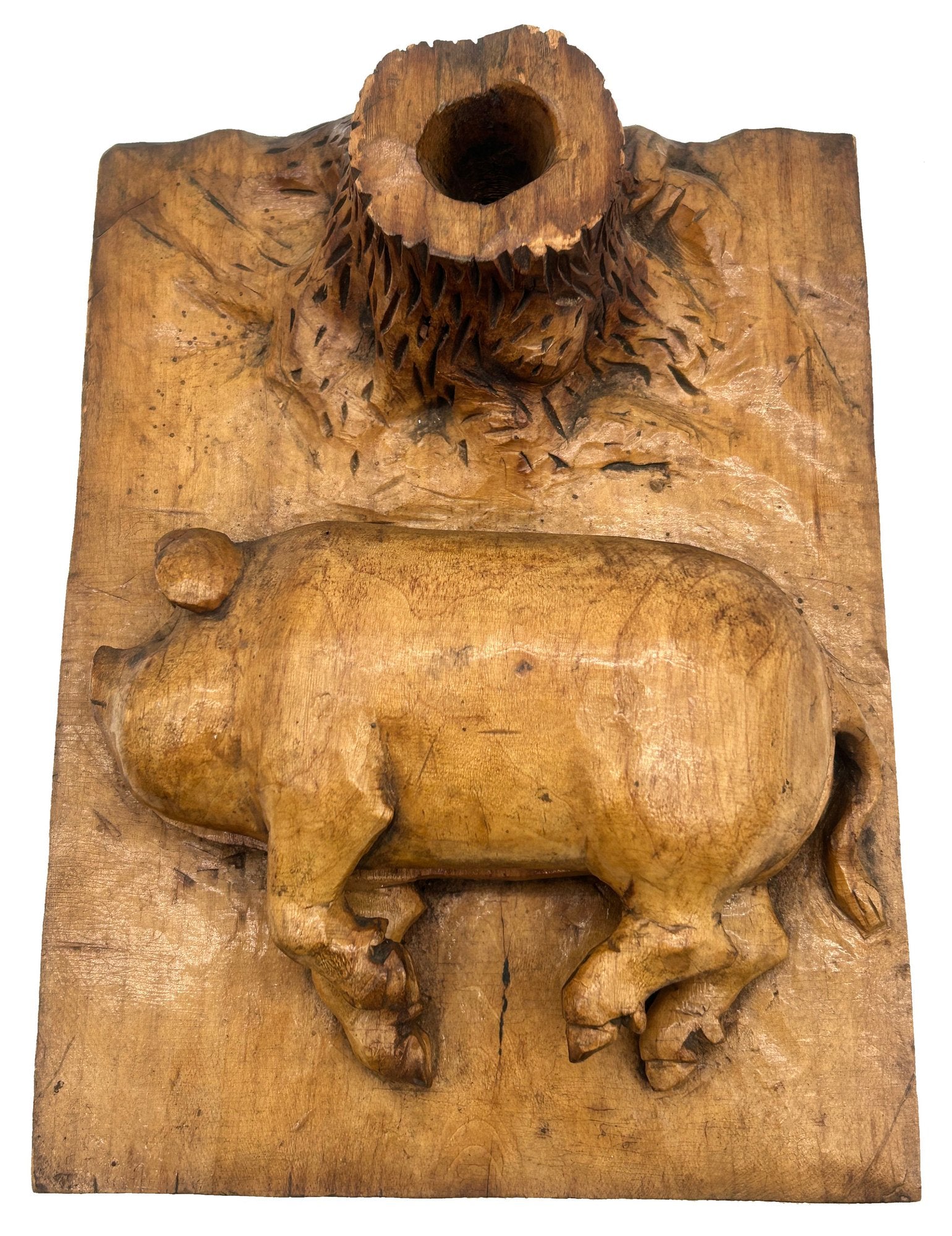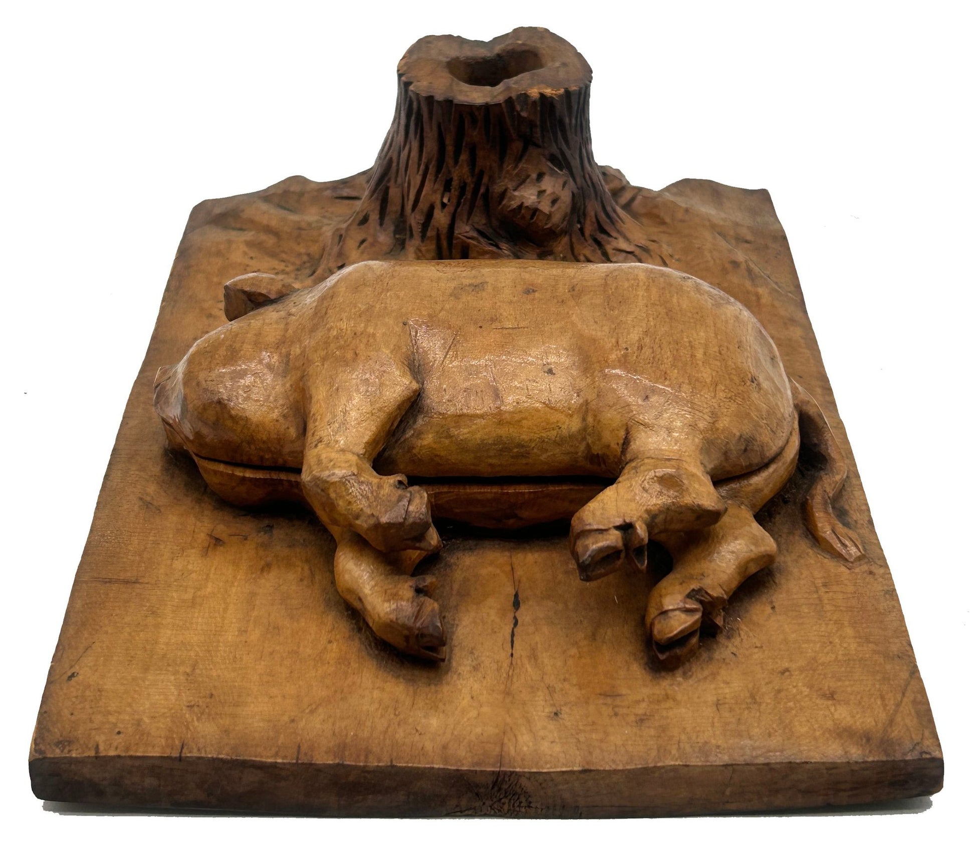 Antique Treenware Carved Hog & Stump Pen Holder/Hinged Stamp Box, Primitive