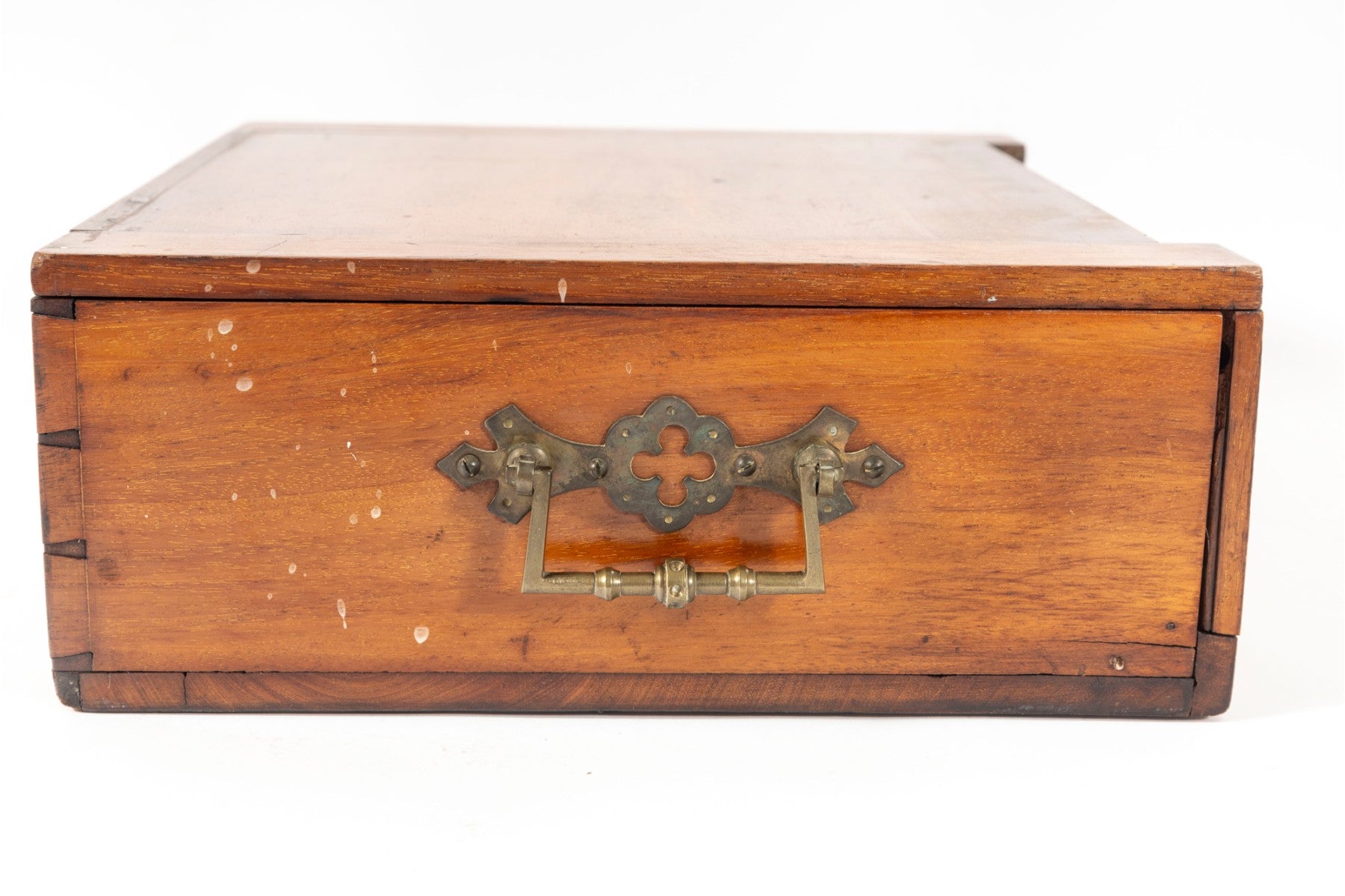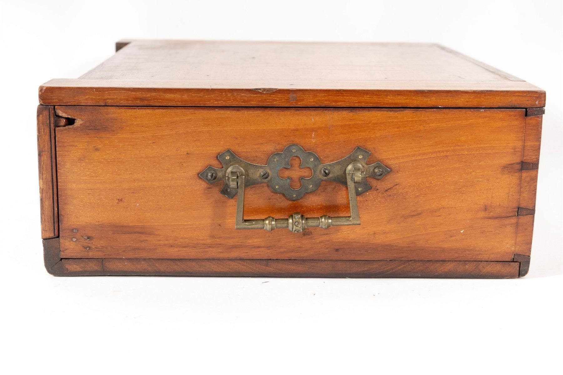 This fabulous antique coin box has small, fine dovetail construction with hinged lid and 6 knobbed felt lined pull-out trays and an additional 3 trays under the bottom knobbed tray.