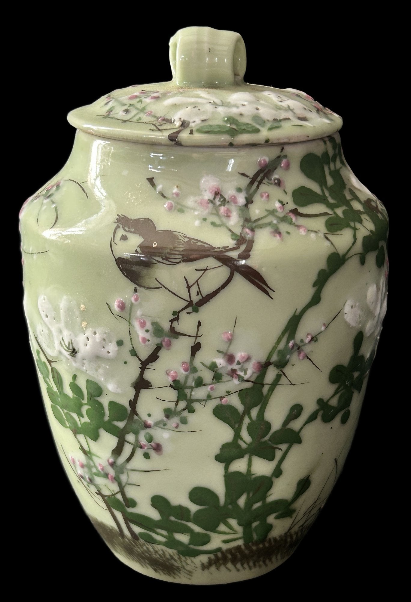 This is a spectacular 7.5"H Antique Japan porcelain seto or celadon green Ginger Jar with Moriage raised designs.