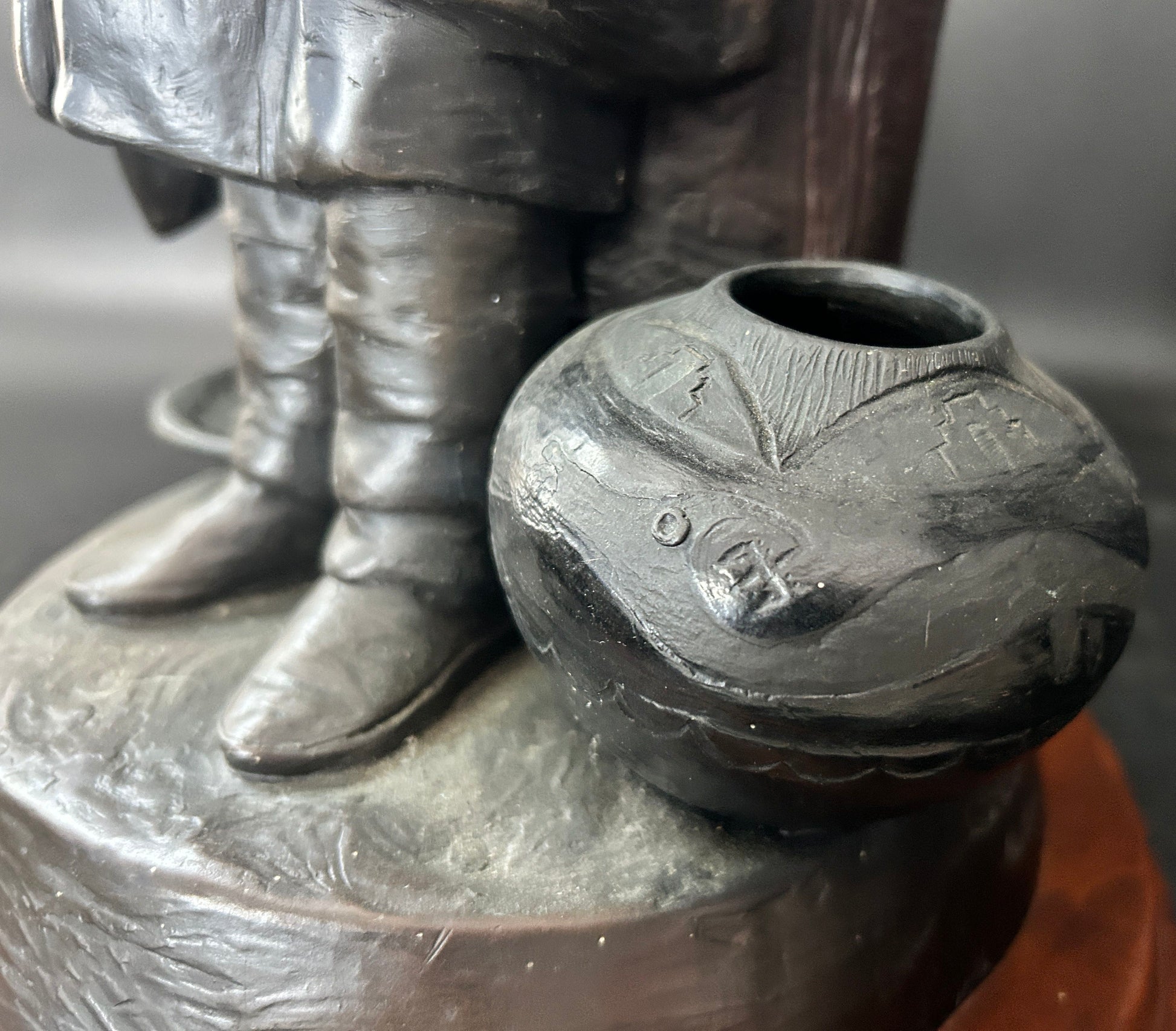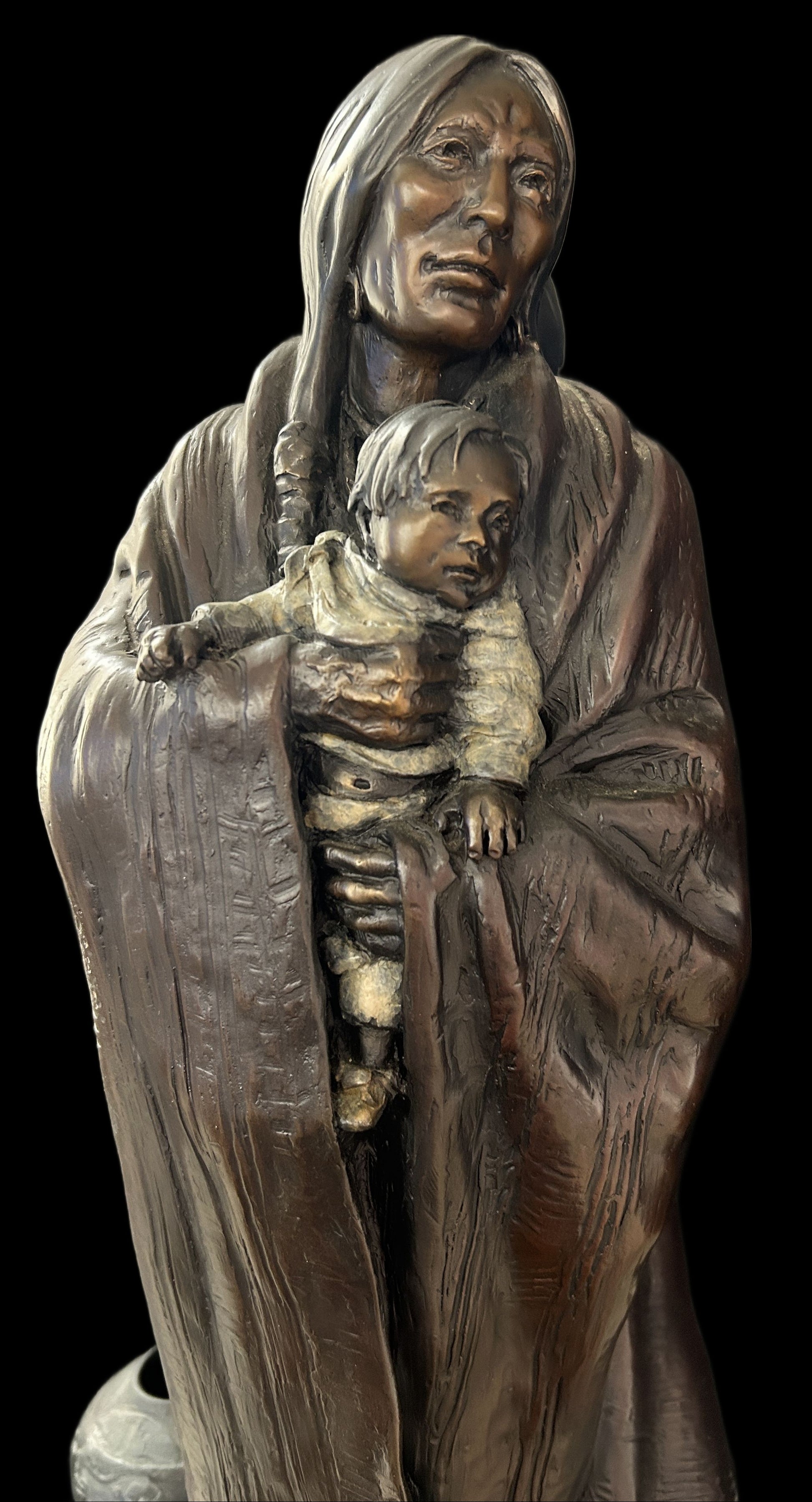 Depicts Maria, Julian Martinez and son of San Ildefonso pueblo, New Mexico. Julian is holding their son, Popovi Da. Susan wanted to depict the importance of the whole family in the revival of a dying art form. "Maria Martinez and her husband Julian, stand back to back, exerting their independence, while to the observer, their robes wed together, uniting them. They kindled a renaissance in pottery for all of the Pueblos."