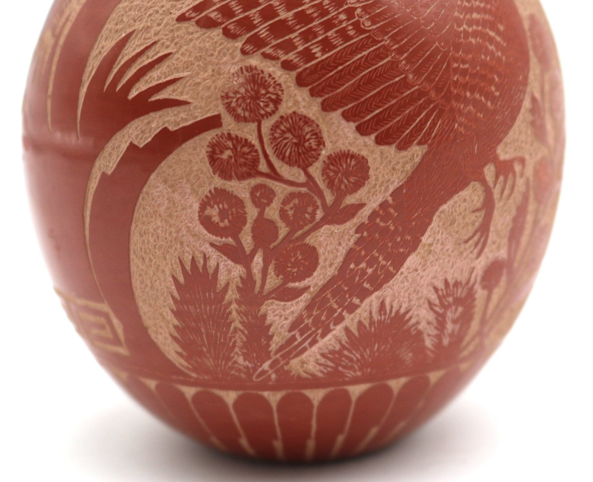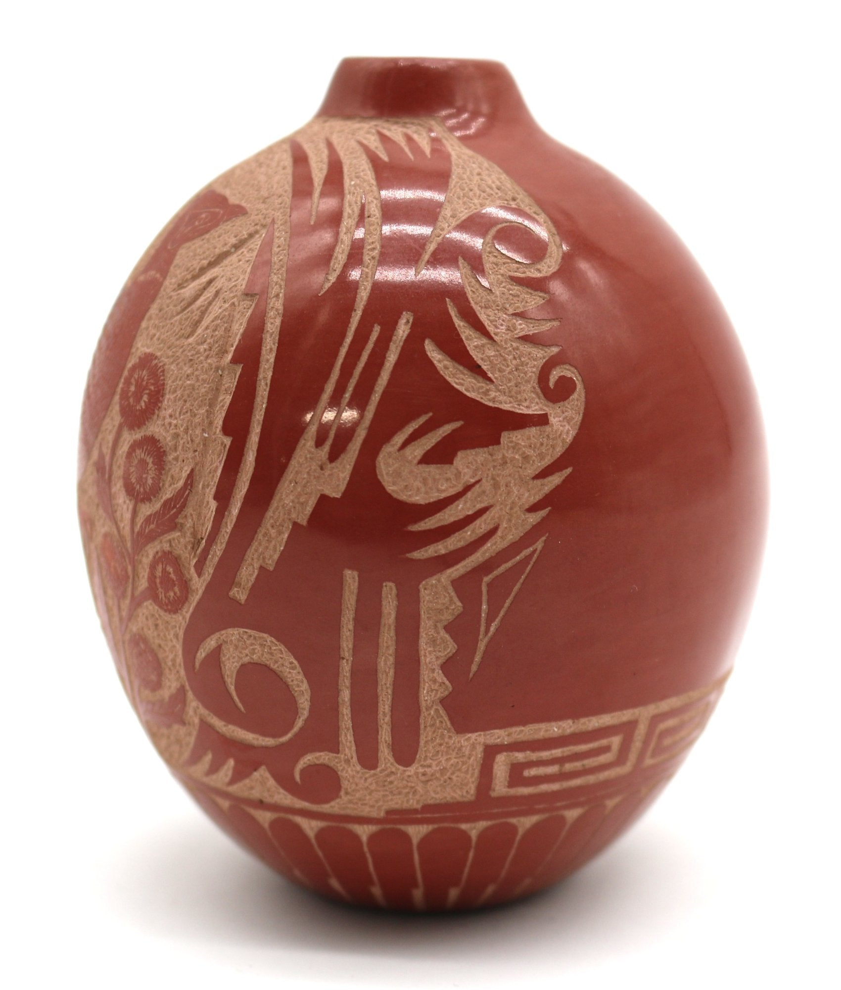 Medicine Flower creates her pottery from local clay that she digs herself at Santa Clara Pueblo. She dries the clay in the sun and fires thework outside. She used a knife or nail to carve her intricate designs using the sgraffito style.