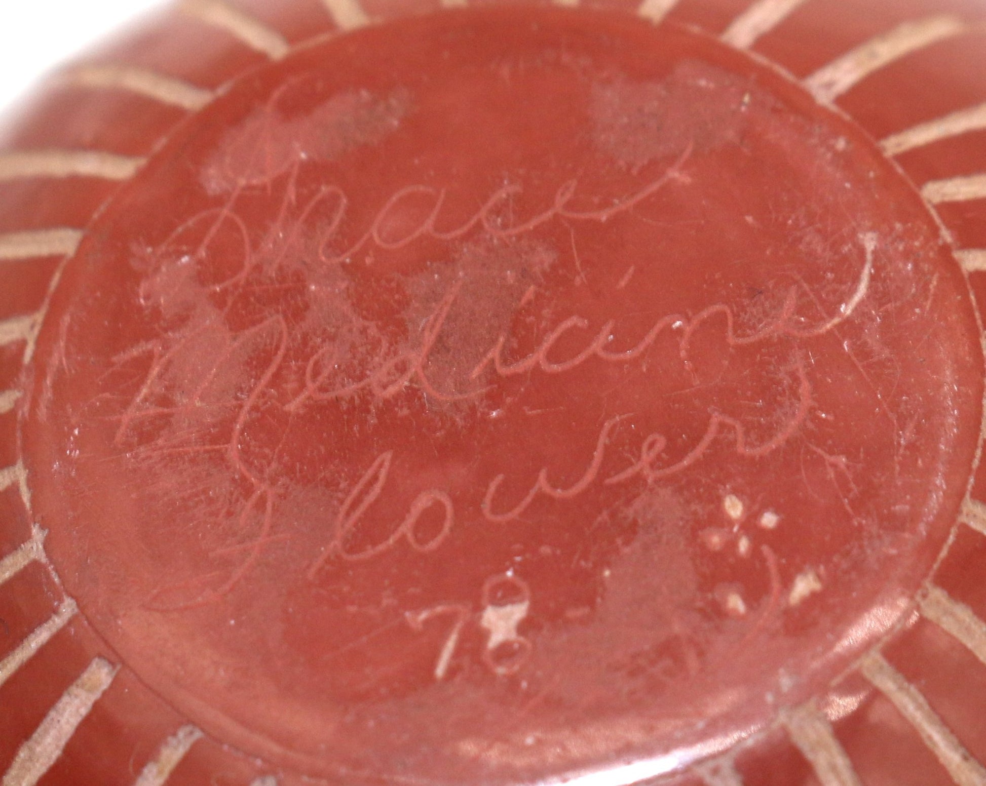 This work features a carved bird which has very minute detail in the feathers, milk thistle and a bottom rim of feathers plus other features. The pot is 3 1/2" High and 3" Wide. It is signed: "Grace Medicine Flower 78" plus her carved flower insignia. There are some light abasions on the bottom but they do not interfere with her signature. An outstanding work by a celebrated Pueblo Artist.