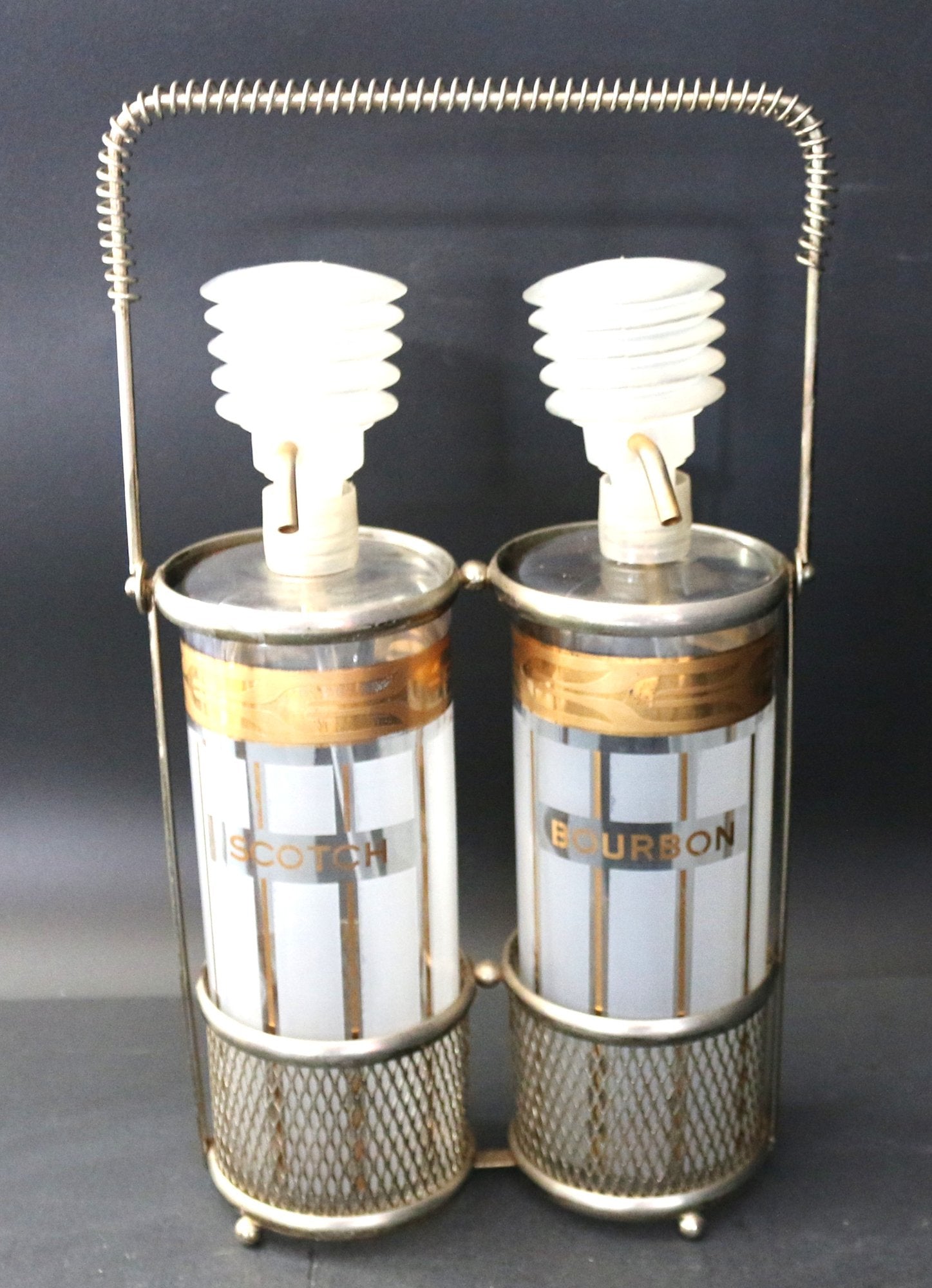250514-32 Vintage MCM 2-Decanter Tantalus, Scotch & Burbon