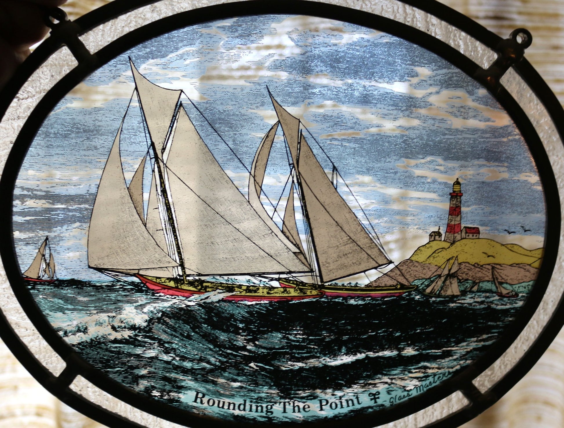 Classic oval leaded stained glass nautical sailing themed light catcher.