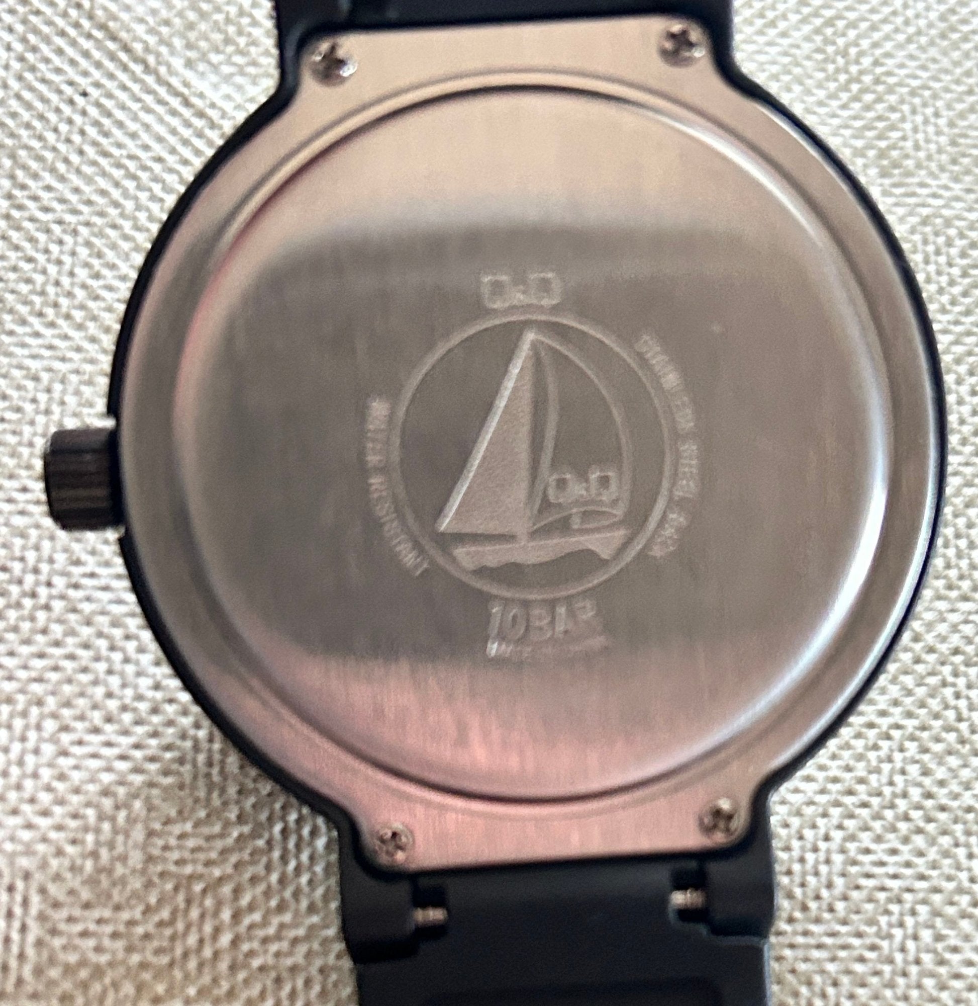 Men's 10-Bar water resistant wrist watch with stainless steel case and silicone band.