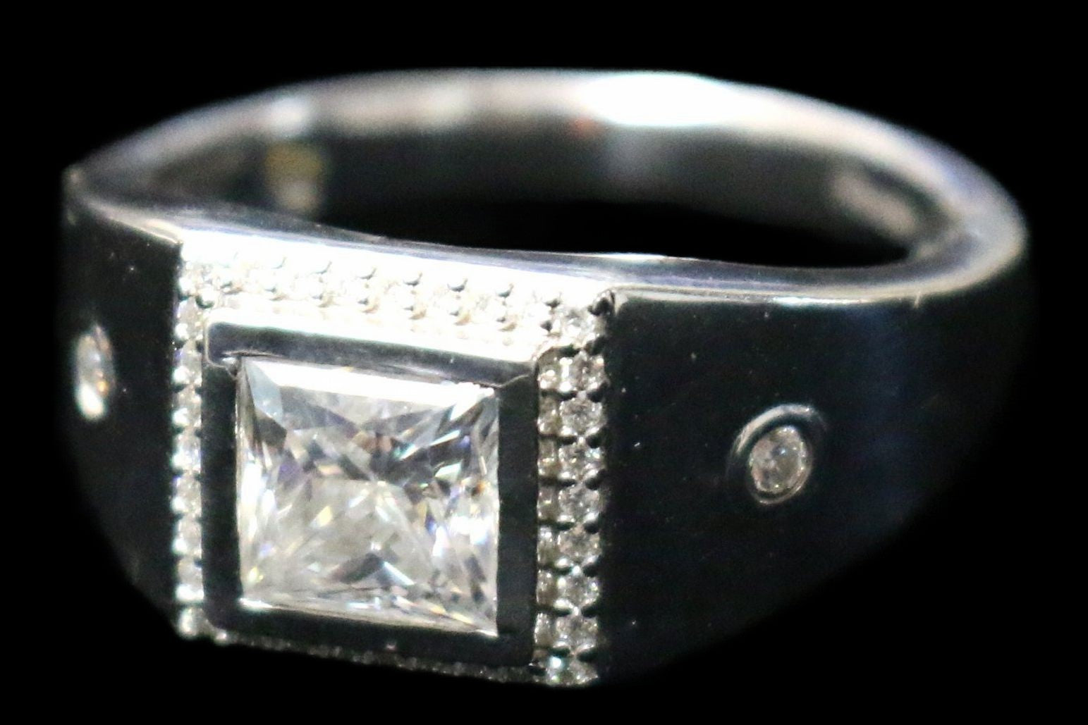 Gorgeous men's sterling silver shank with large square CZ flanked by a single stone on either side. Size 11.5