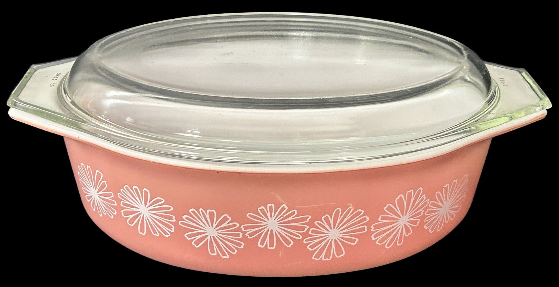 This vintage 1956 Pyrex Pink Daisy 2-1/2 qt oval baking and storage dish. There is a slight rim chip to the lid.