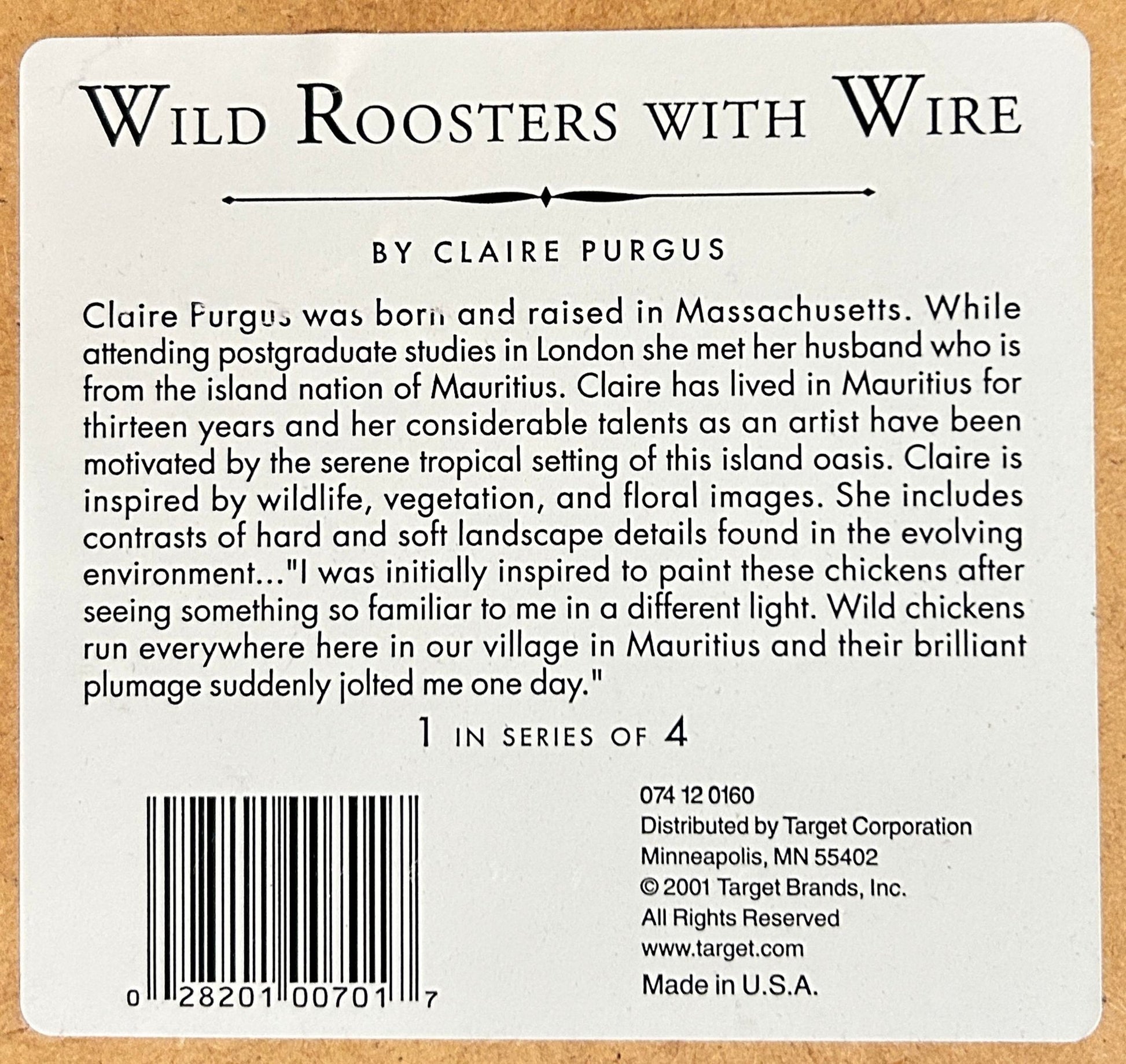 The piece is from the Wild Roosters With Wire collection by Claire Purgus