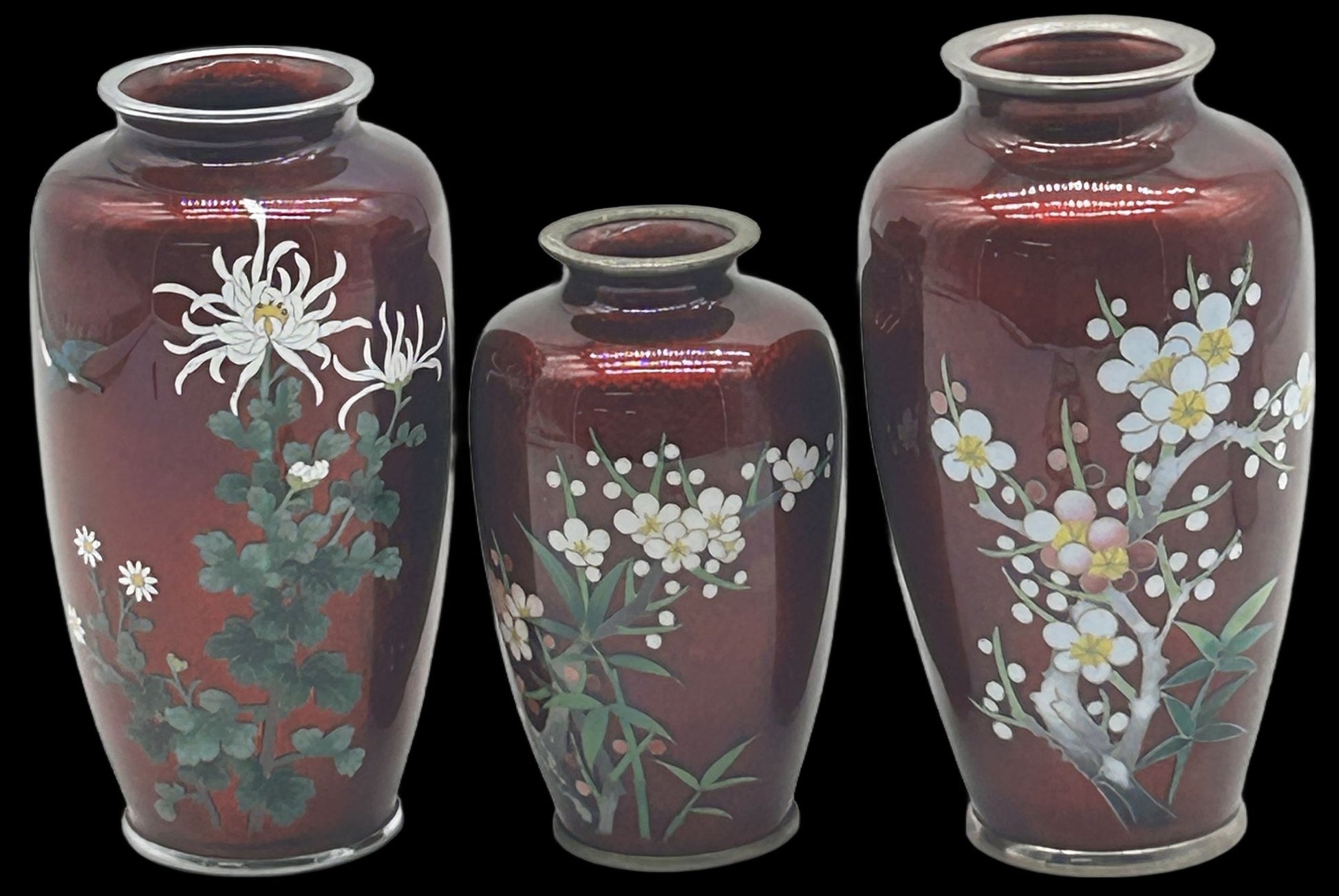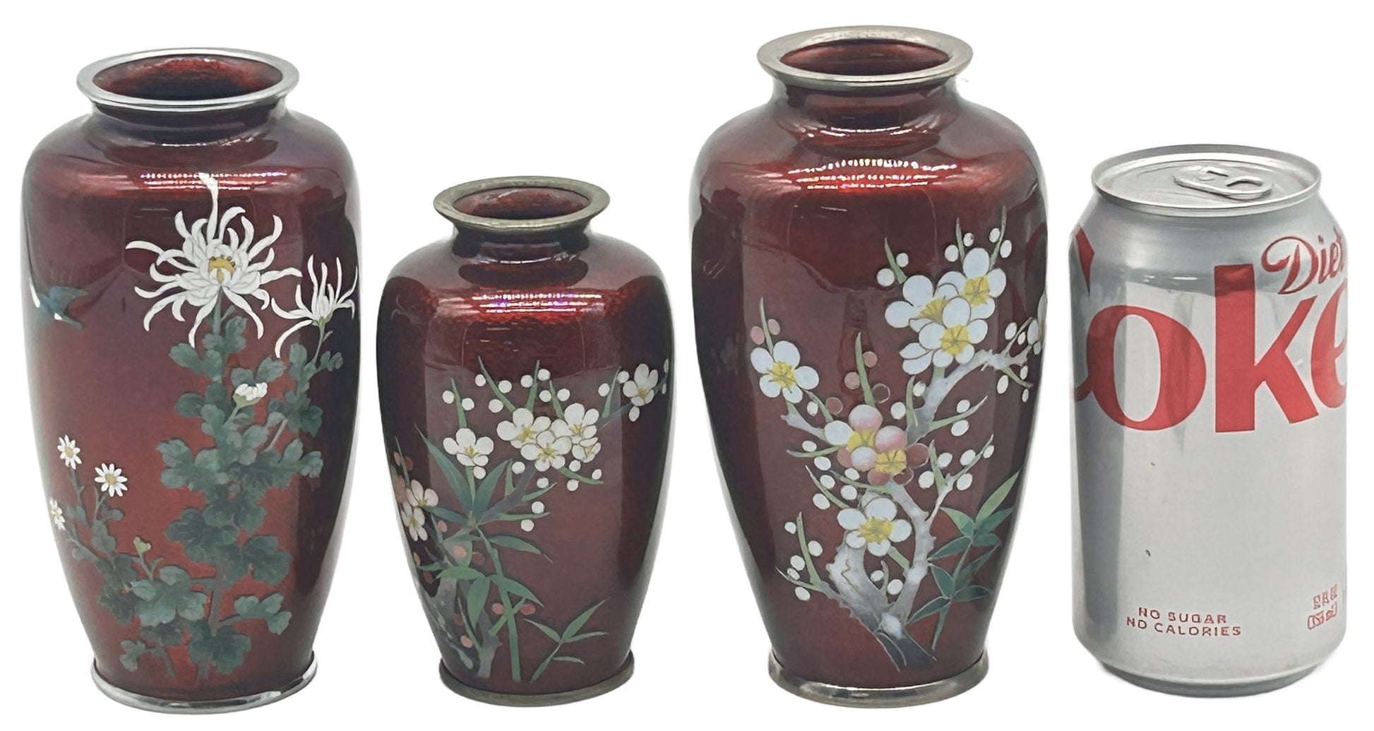 Each of these stunning Japanese pigeon blood red enameled cloisonne vases stand 6"H