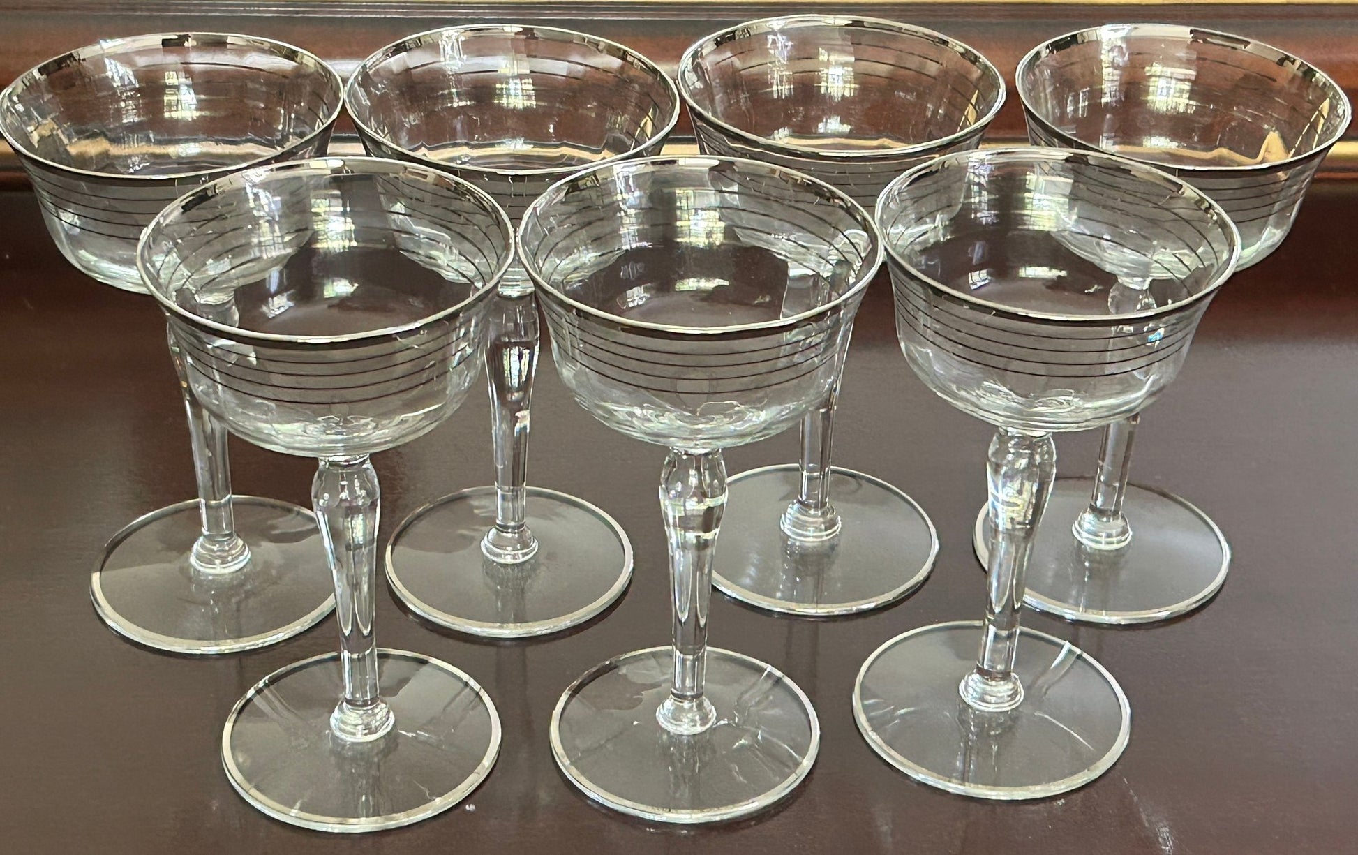 Beautiful set of 7 platinum ringed Art Deco champagne coupes, each 5-1/8"H