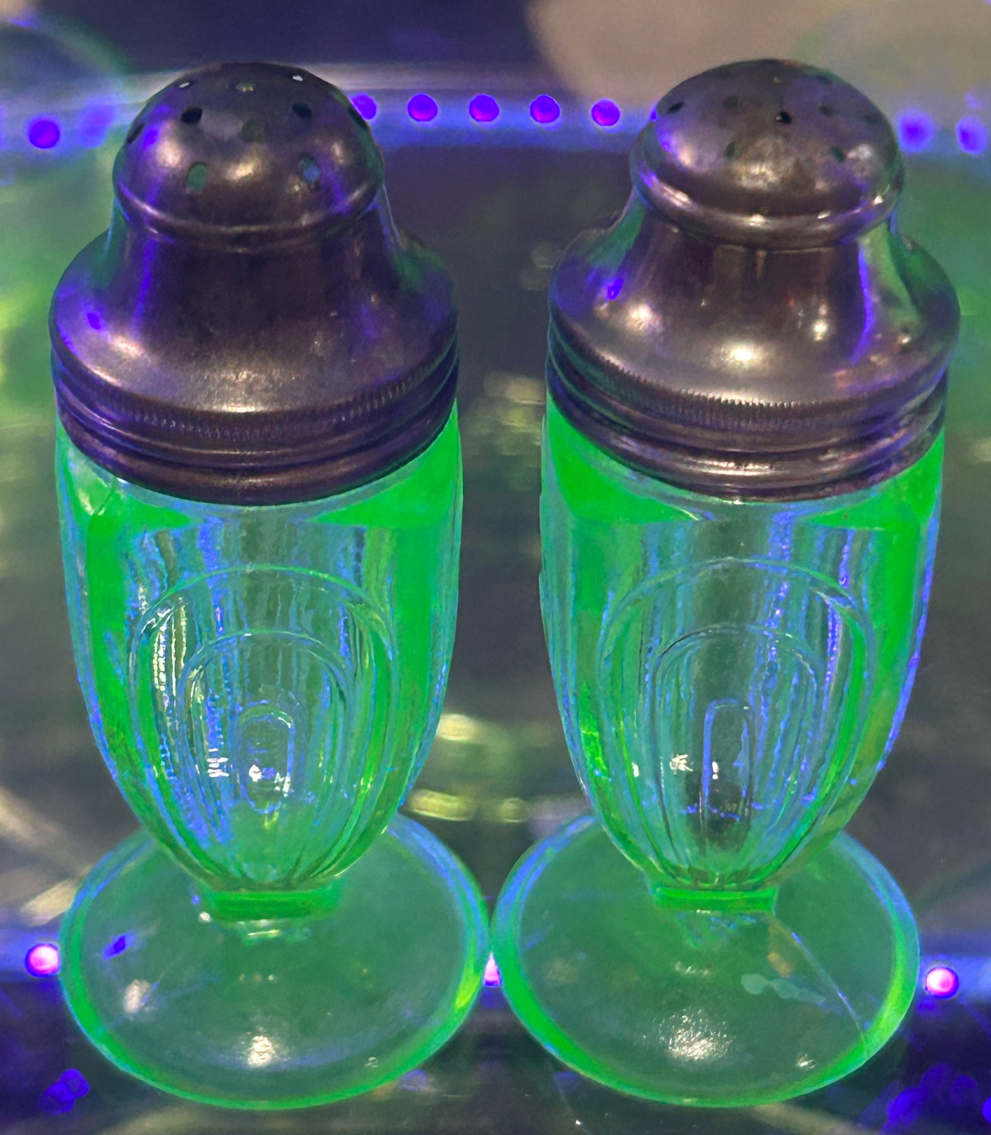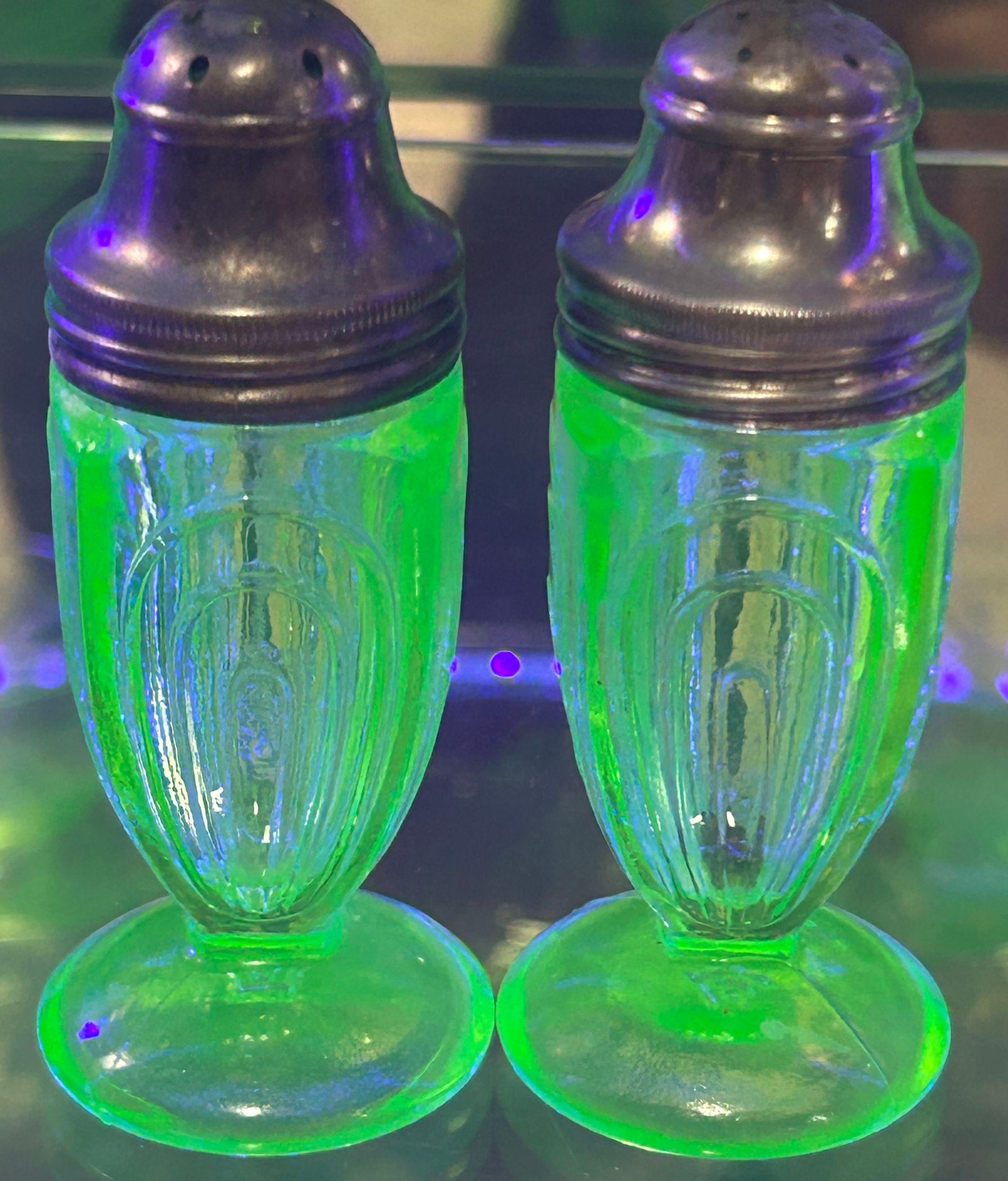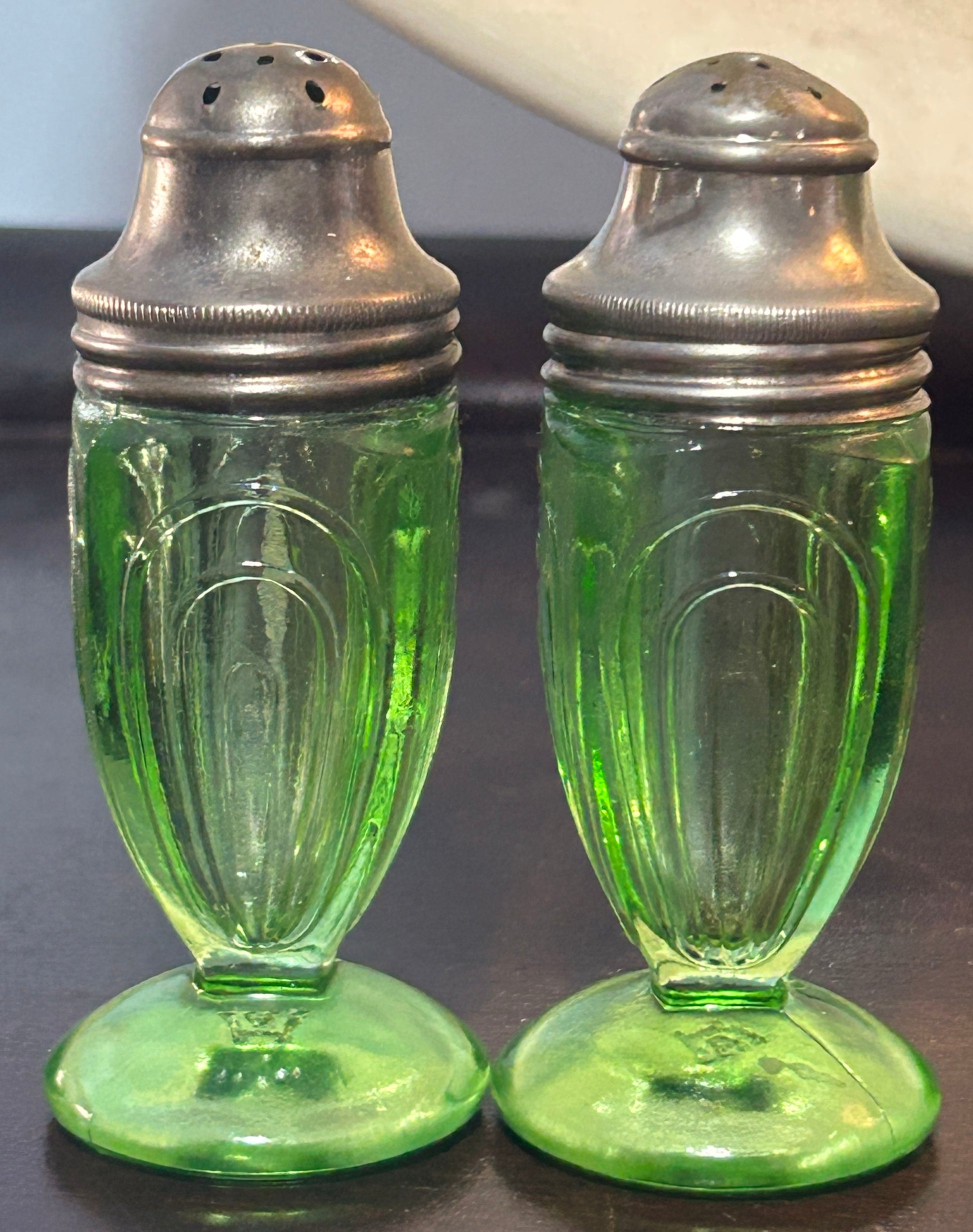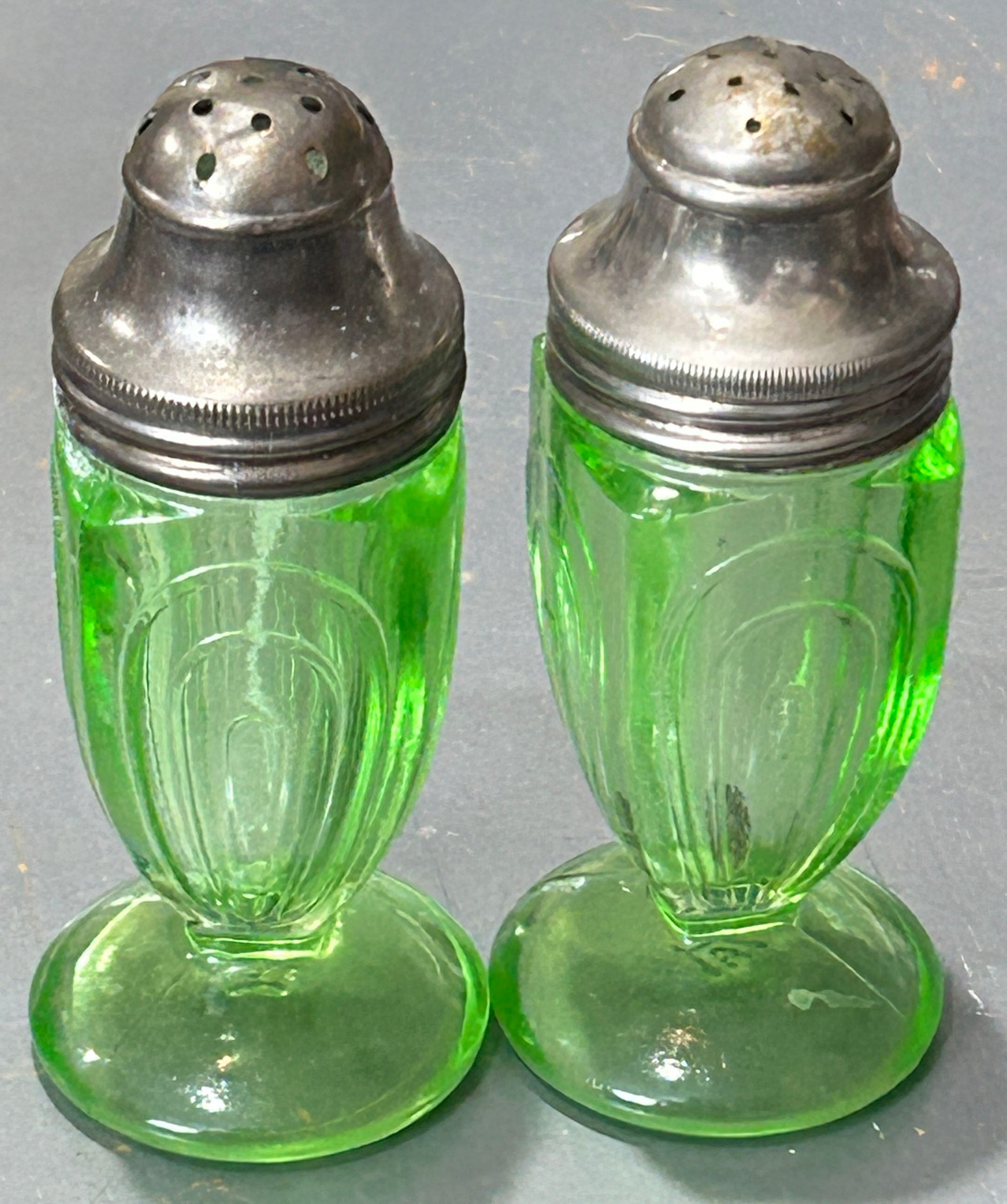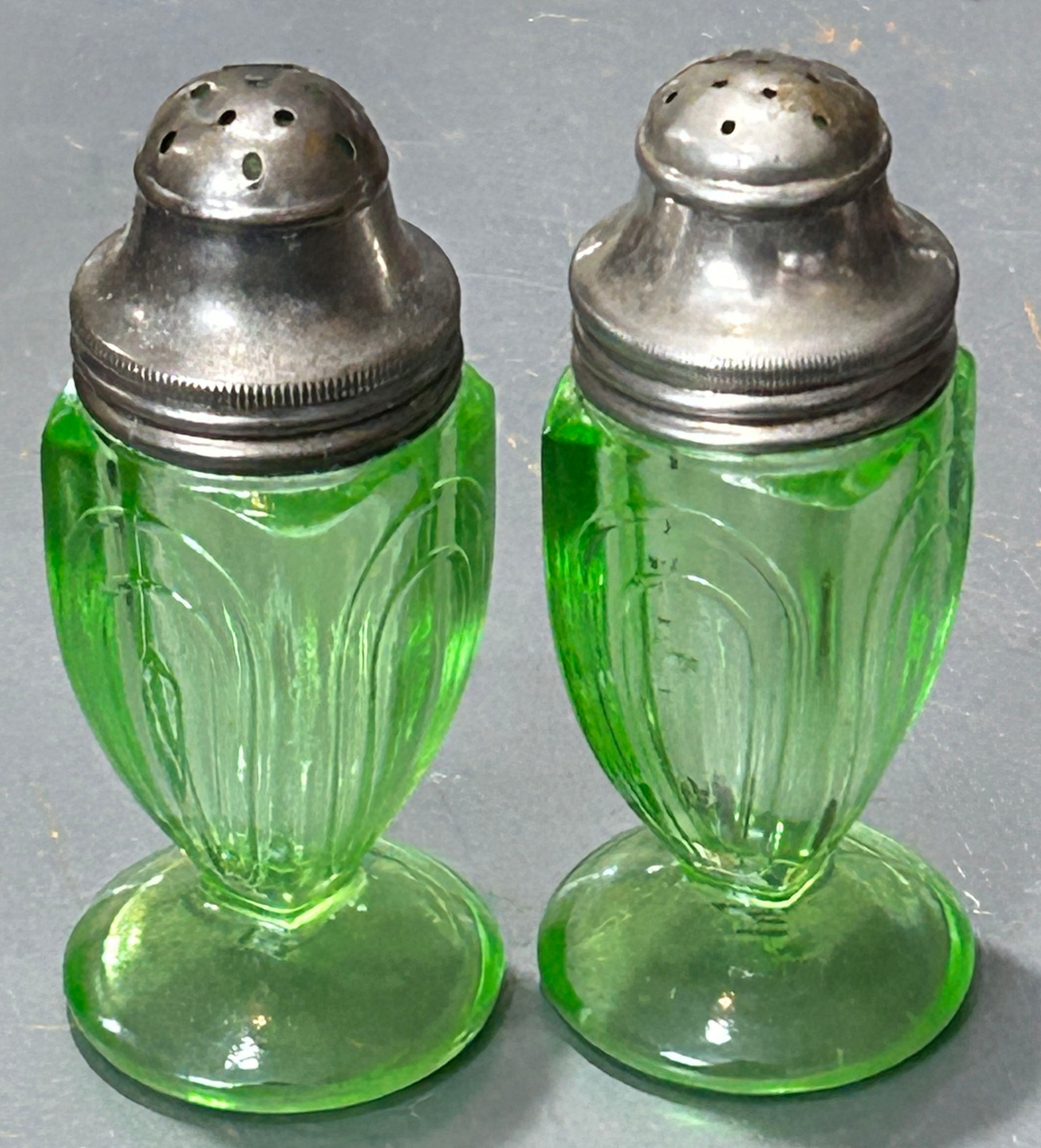 This pair of depression era green uranium glass salt & peer shakers were made by Hazel-Atlas are in the Paper Clip or Ribbon pattern.