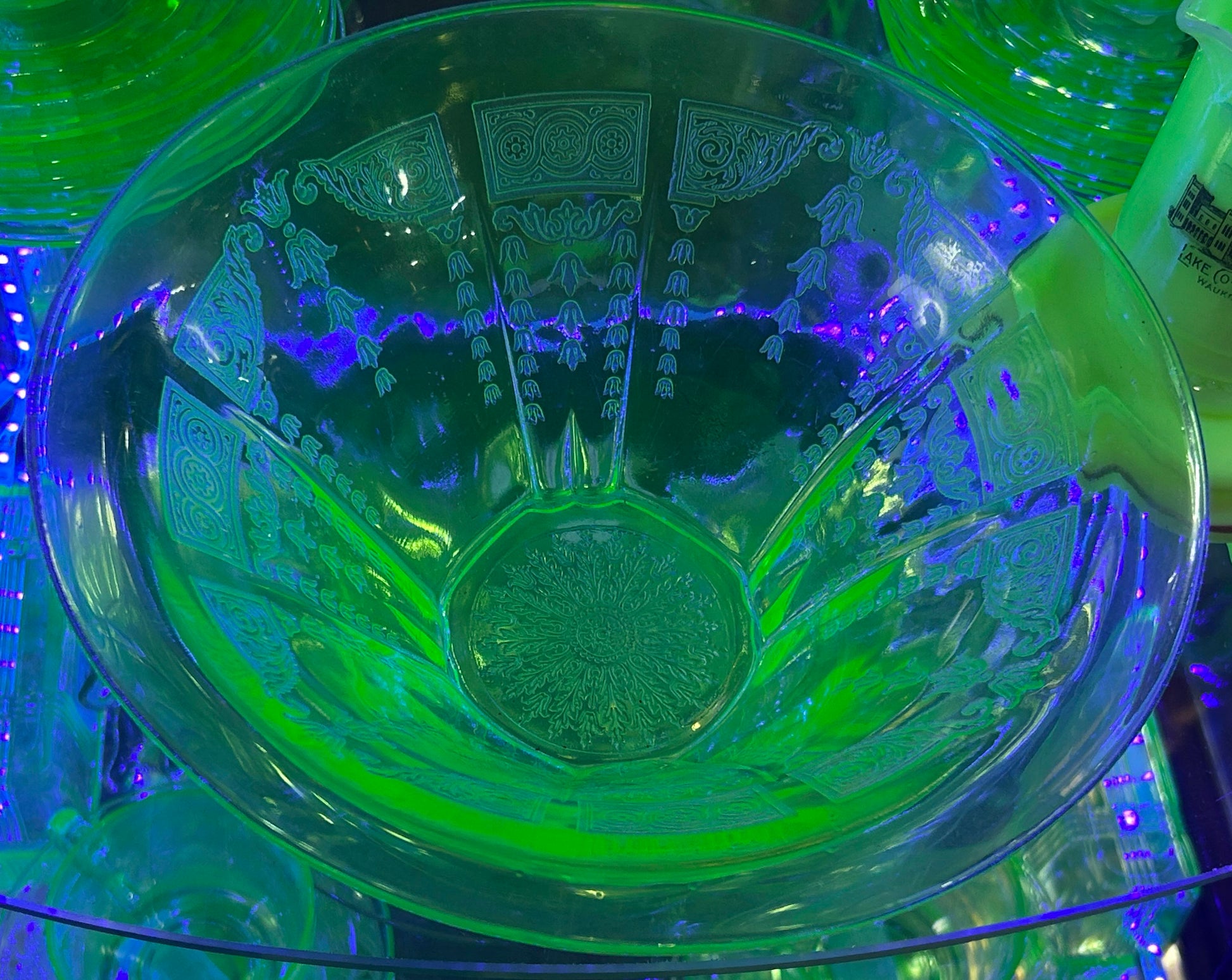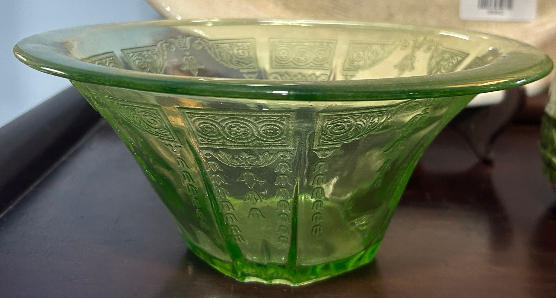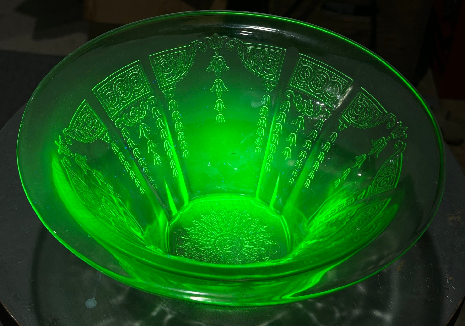 This is a depression era Anchor Hocking green uranium glass vegetable bowl in the Princess pattern.