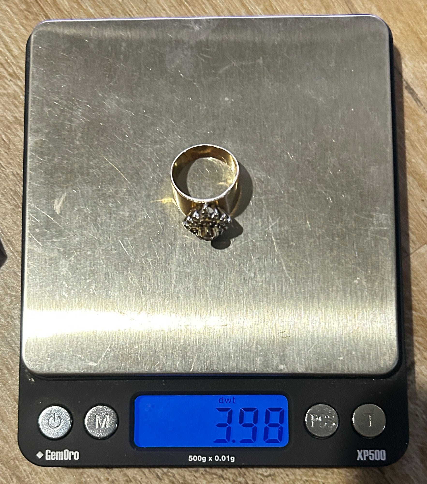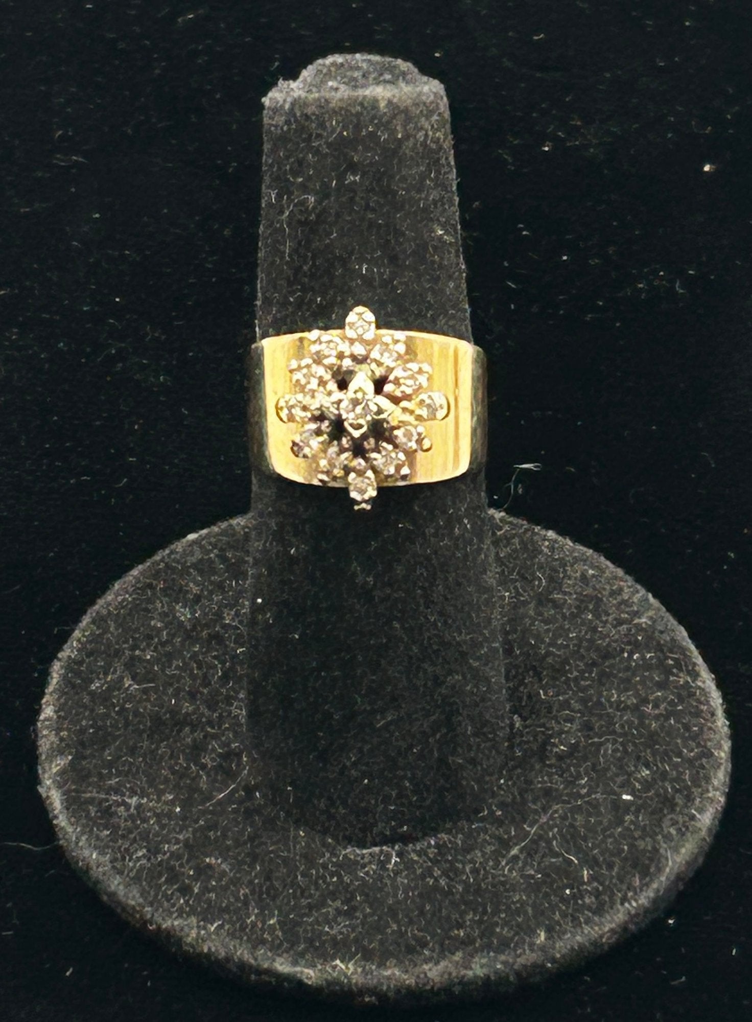 Size 6.25 14KP yellow gold and diamond cluster wide band ring.