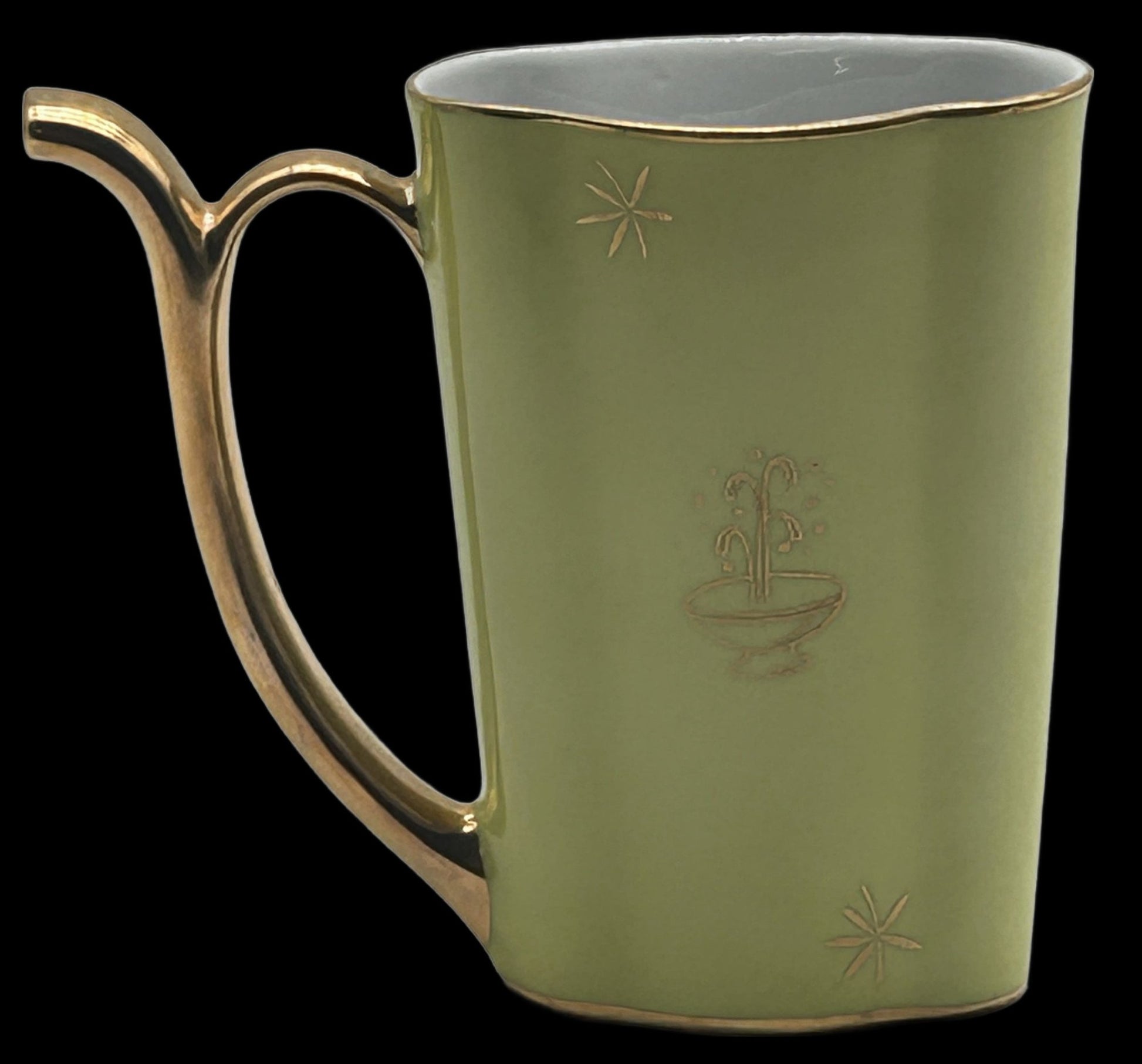 This unusual shaped, bight lime-green sipping cup is from the Czech Republic Karlovy Vary Hot Mineral Spa. Guests Walk around with these sipping cups sipping the hot mineral water, and stands 5.5"H.