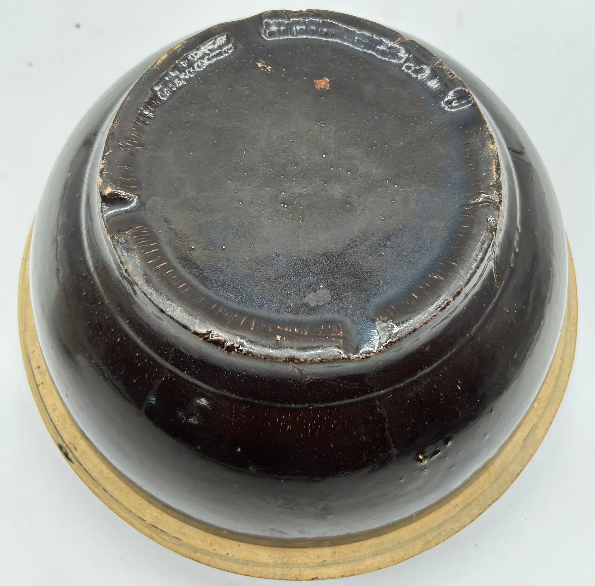 There are no maker's marks on this antique brown high gloss glazed mixing bowl that measures 10-3/8" Diam. There are a couple minor chips from normal use, wear and tear.