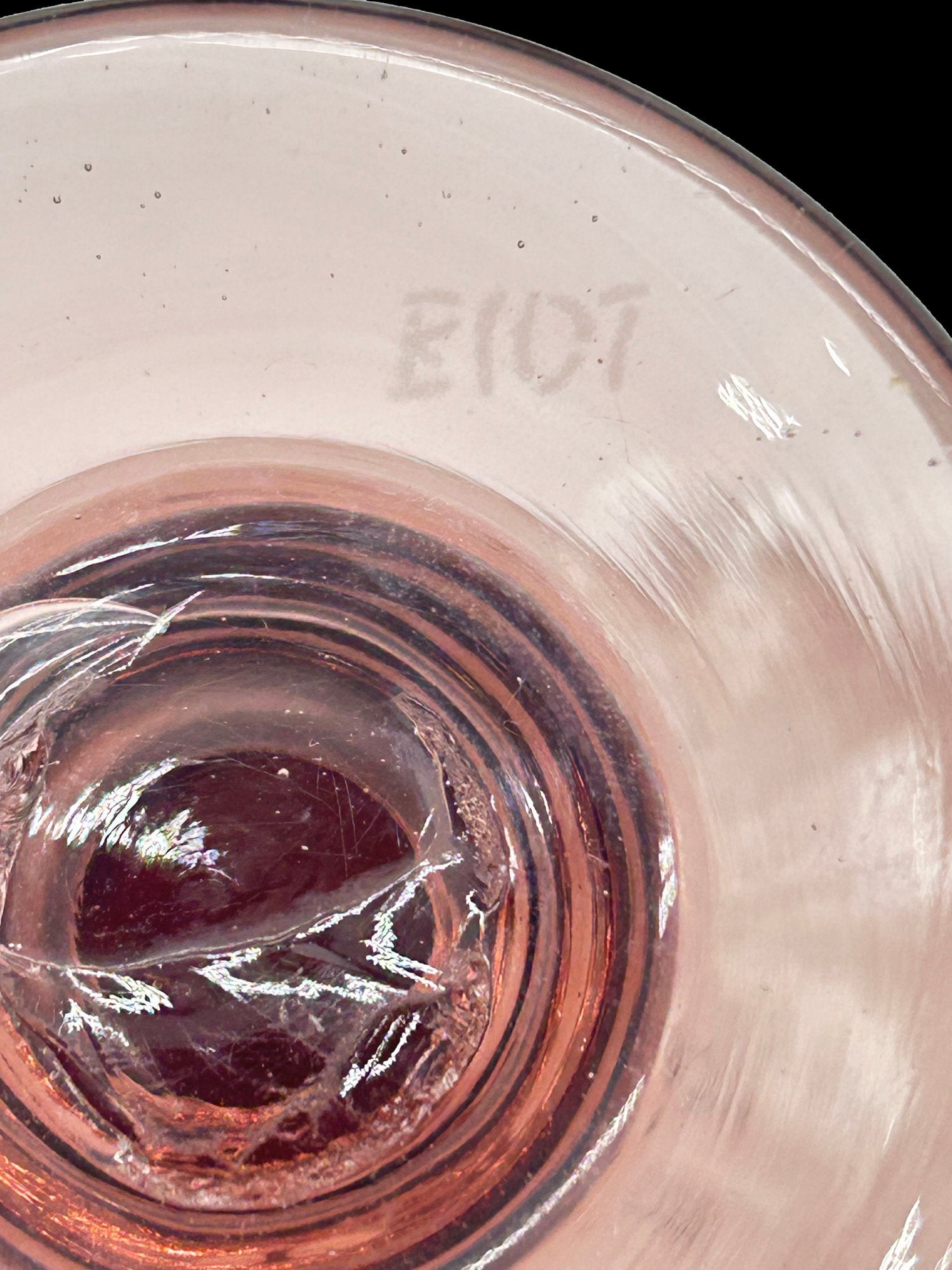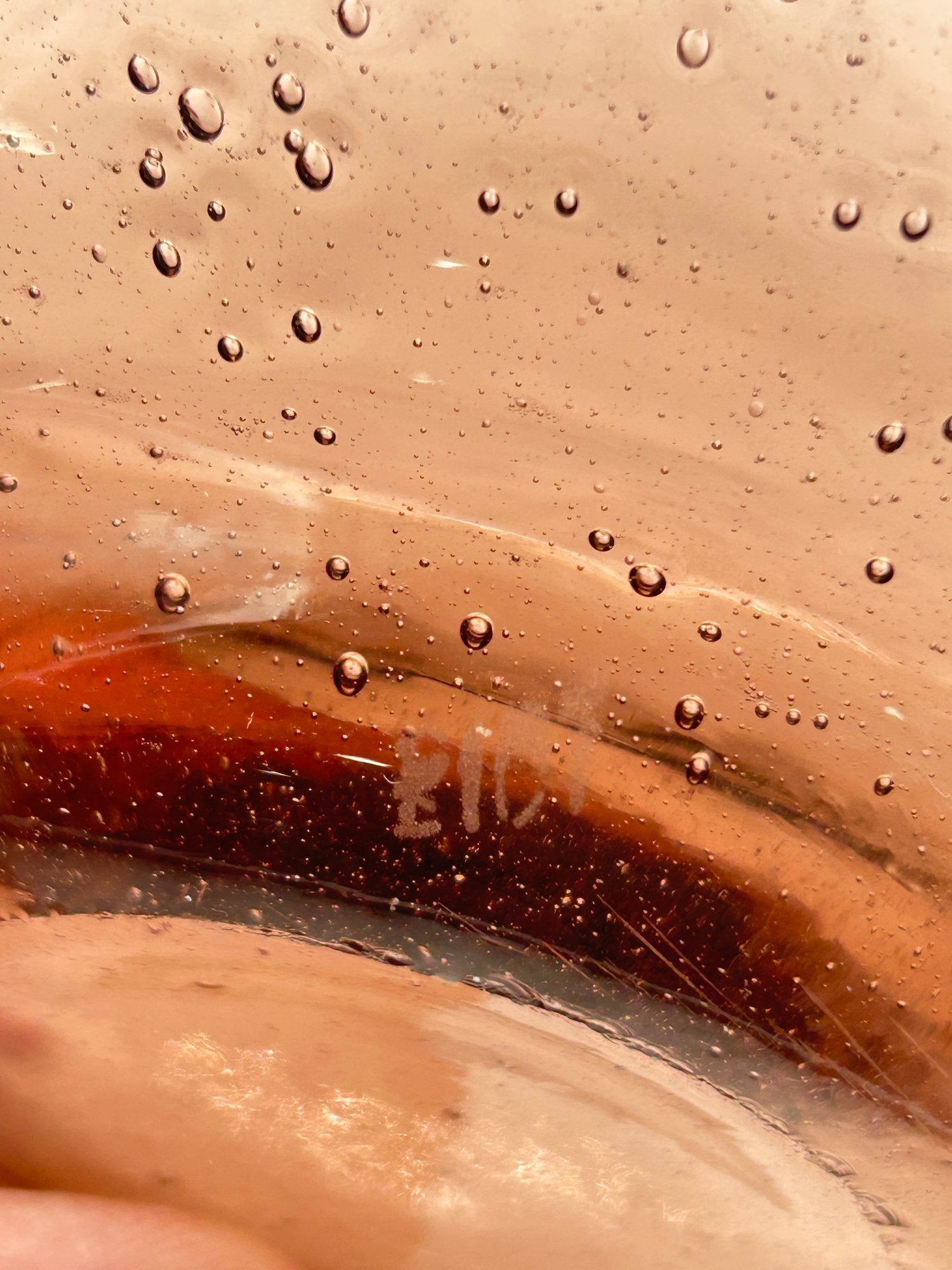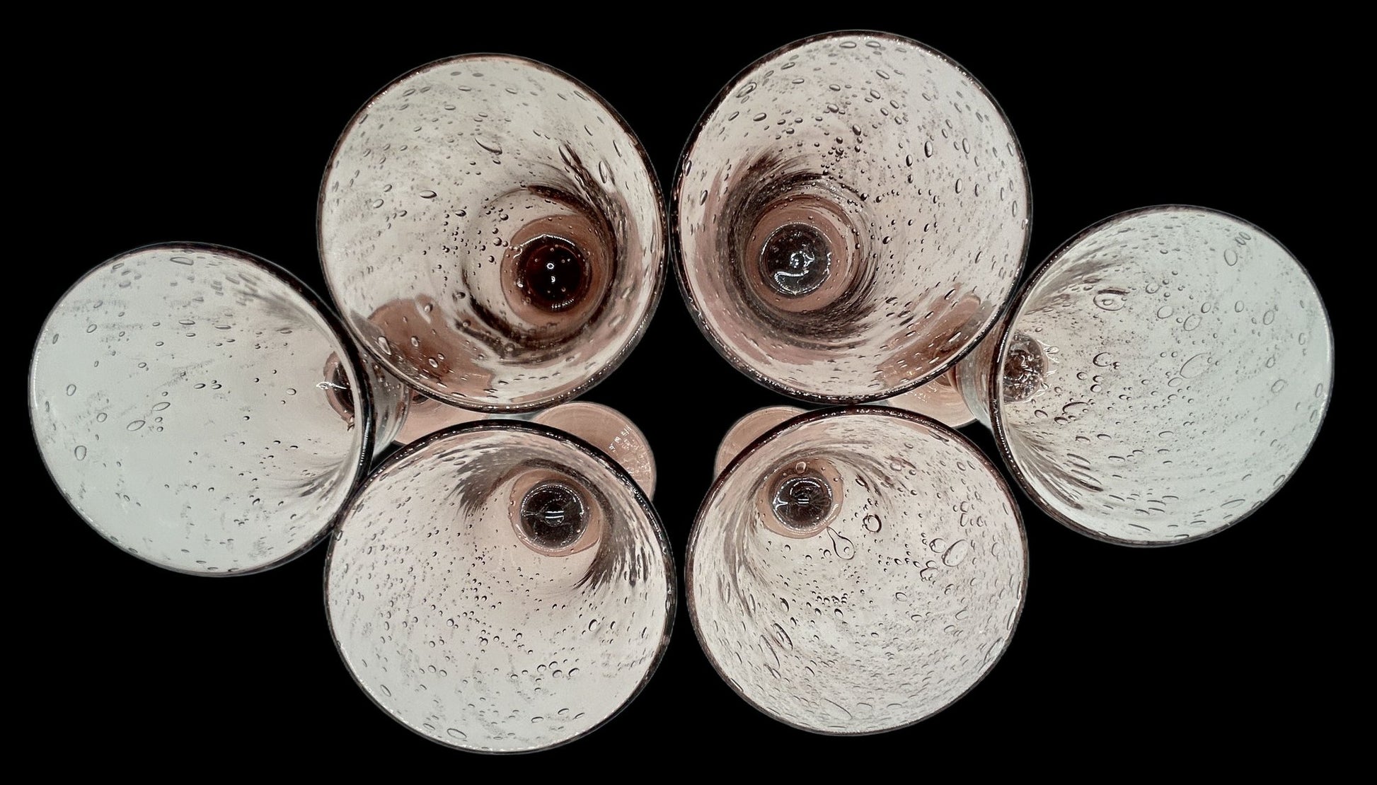 This is a spectacular hand-blown amethyst bubble glass decanter set consisting of a 12"h decanter and six stemmed glasses. Each piece is etched on the base with a maker's mark.