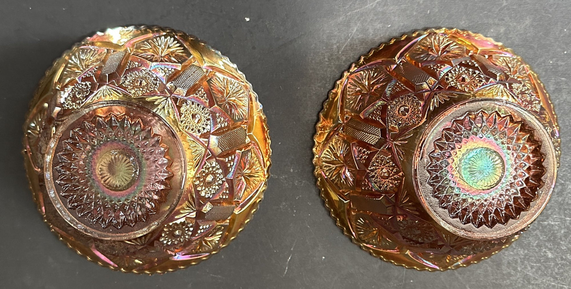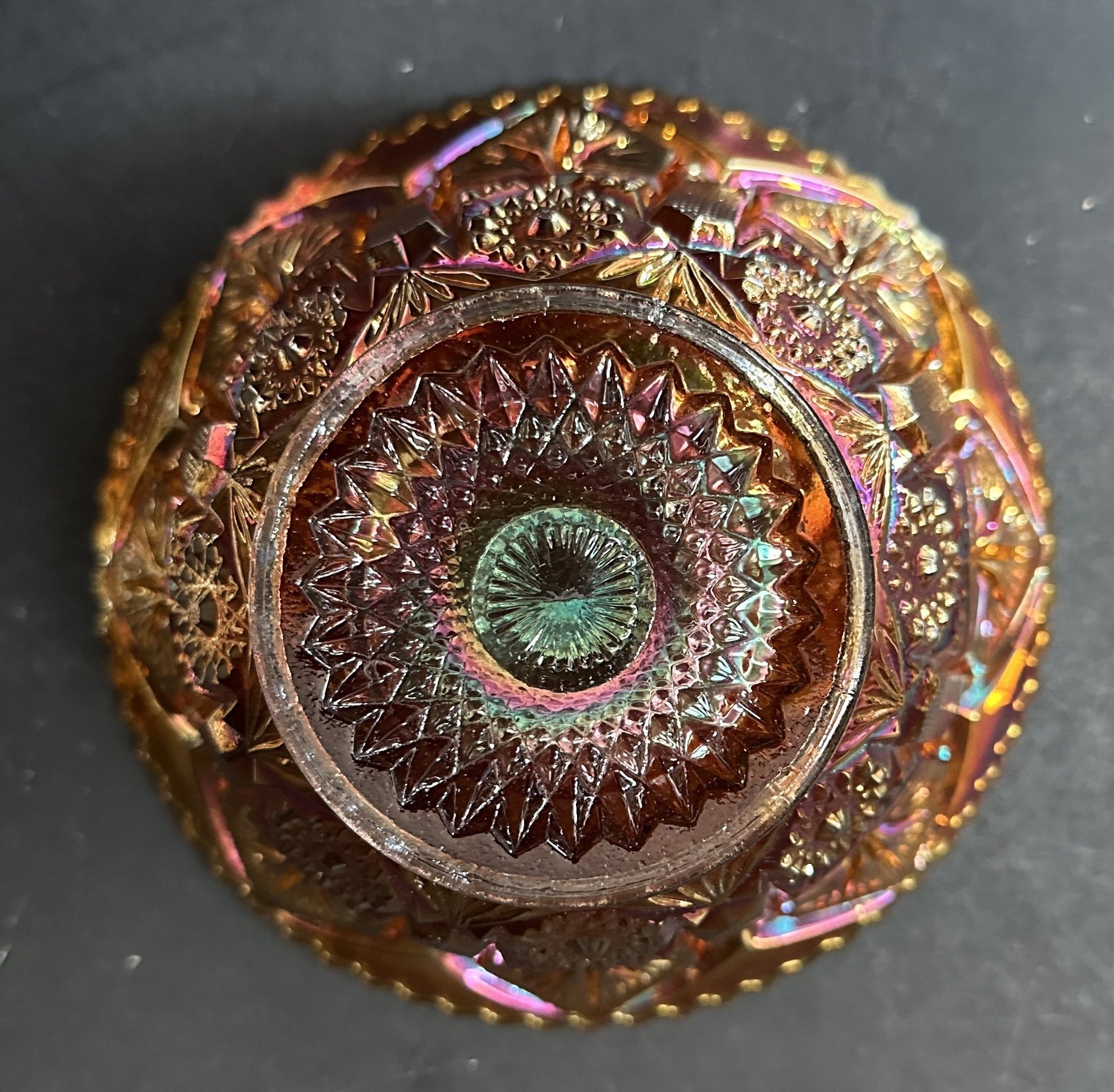 This is a vintage Imperial Glass orange Star & Fire carnival glass bowl in excellent condition, 3.5"h.