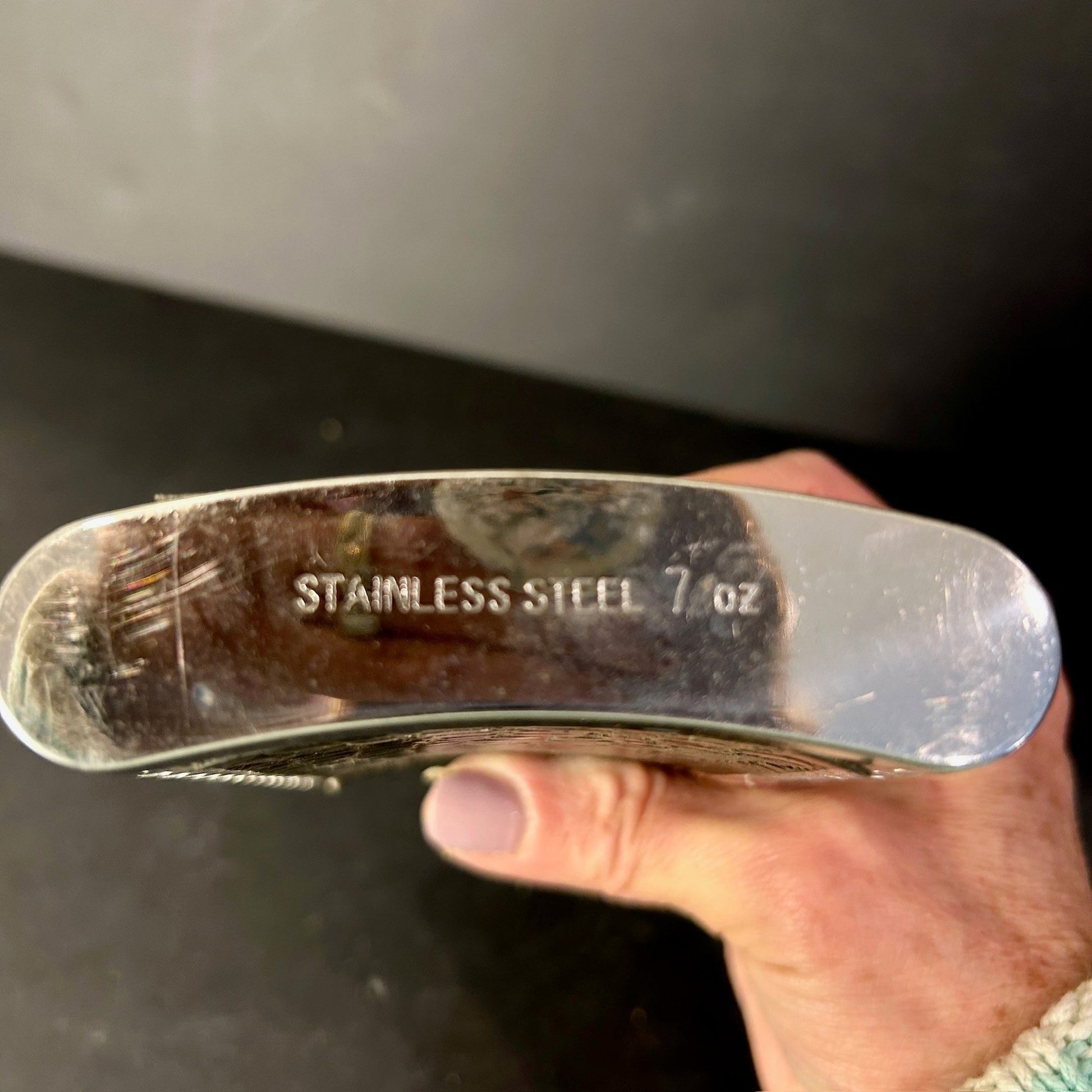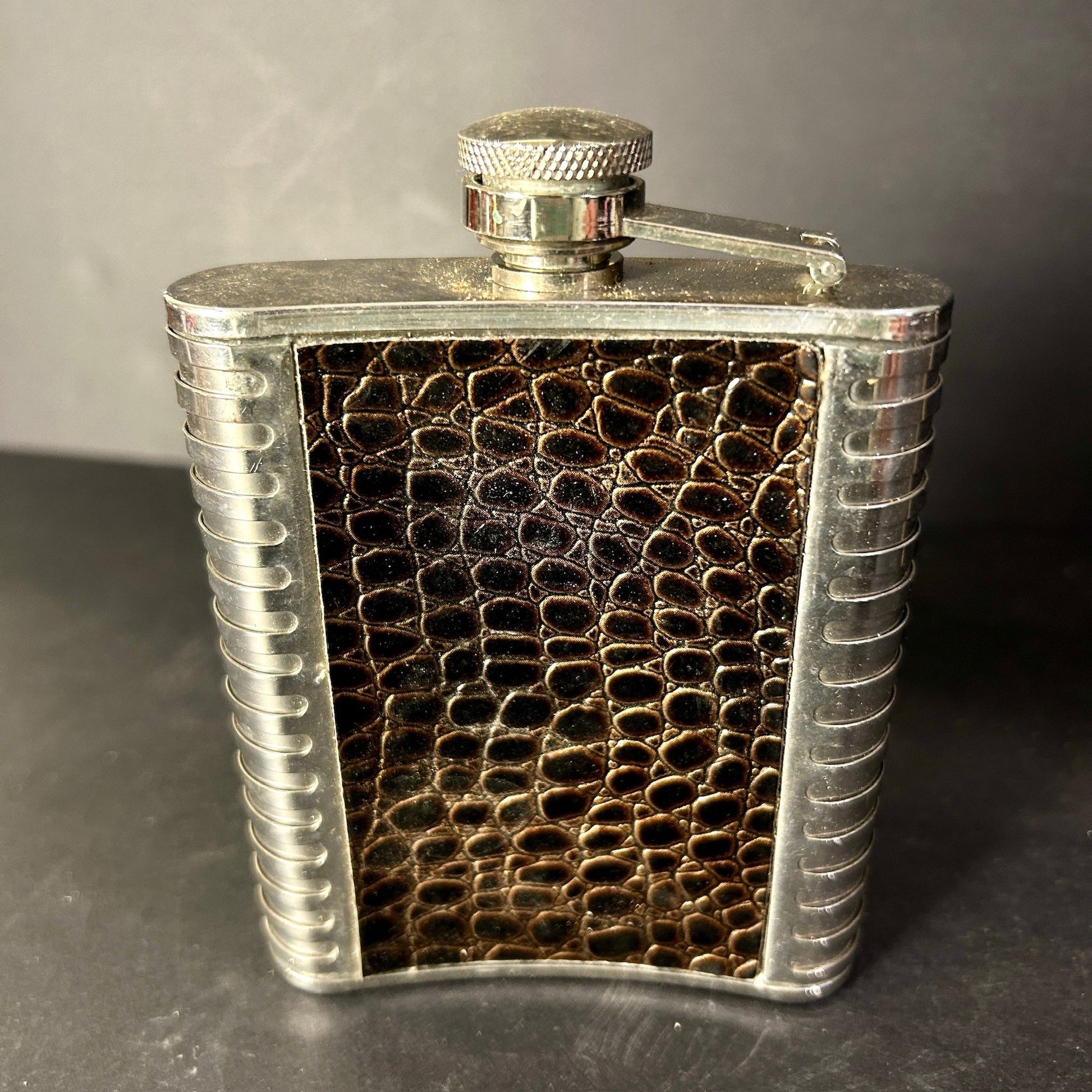 Vintage 7oz stainless pocket flask with tooled leather.