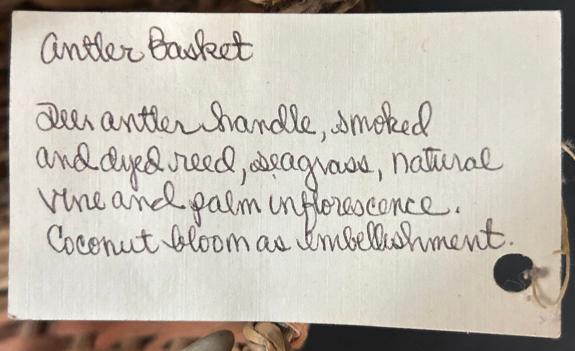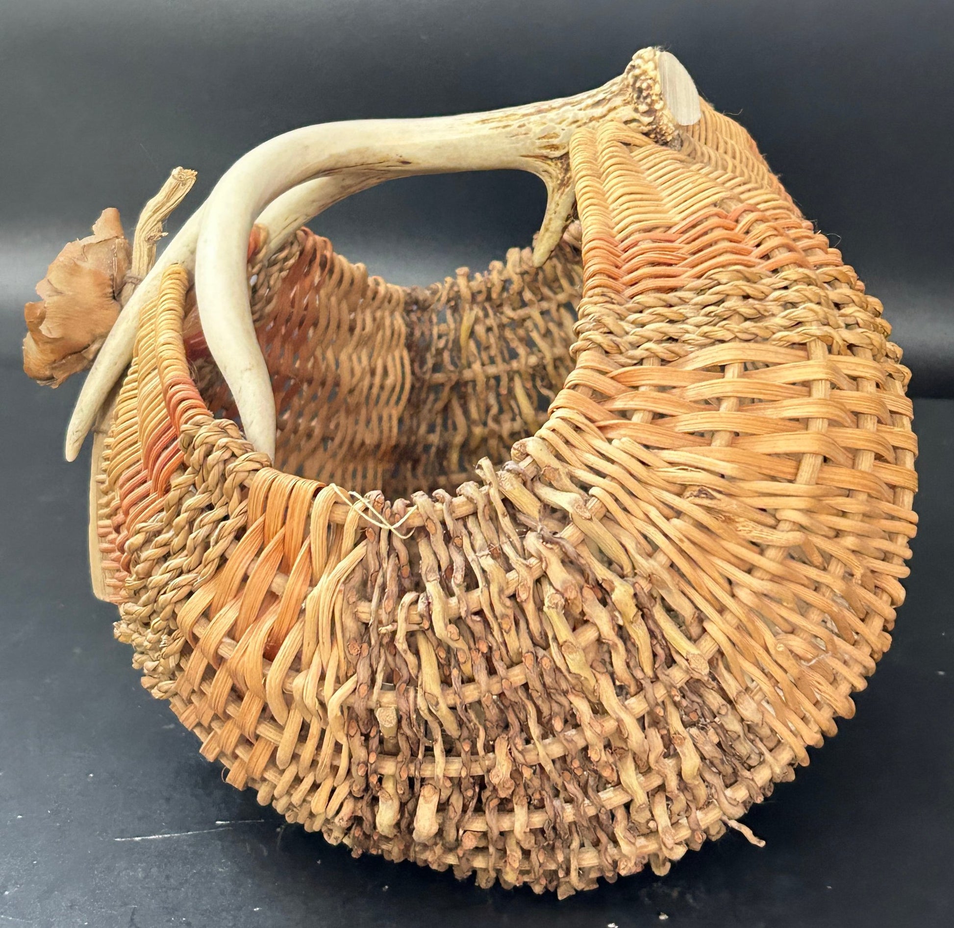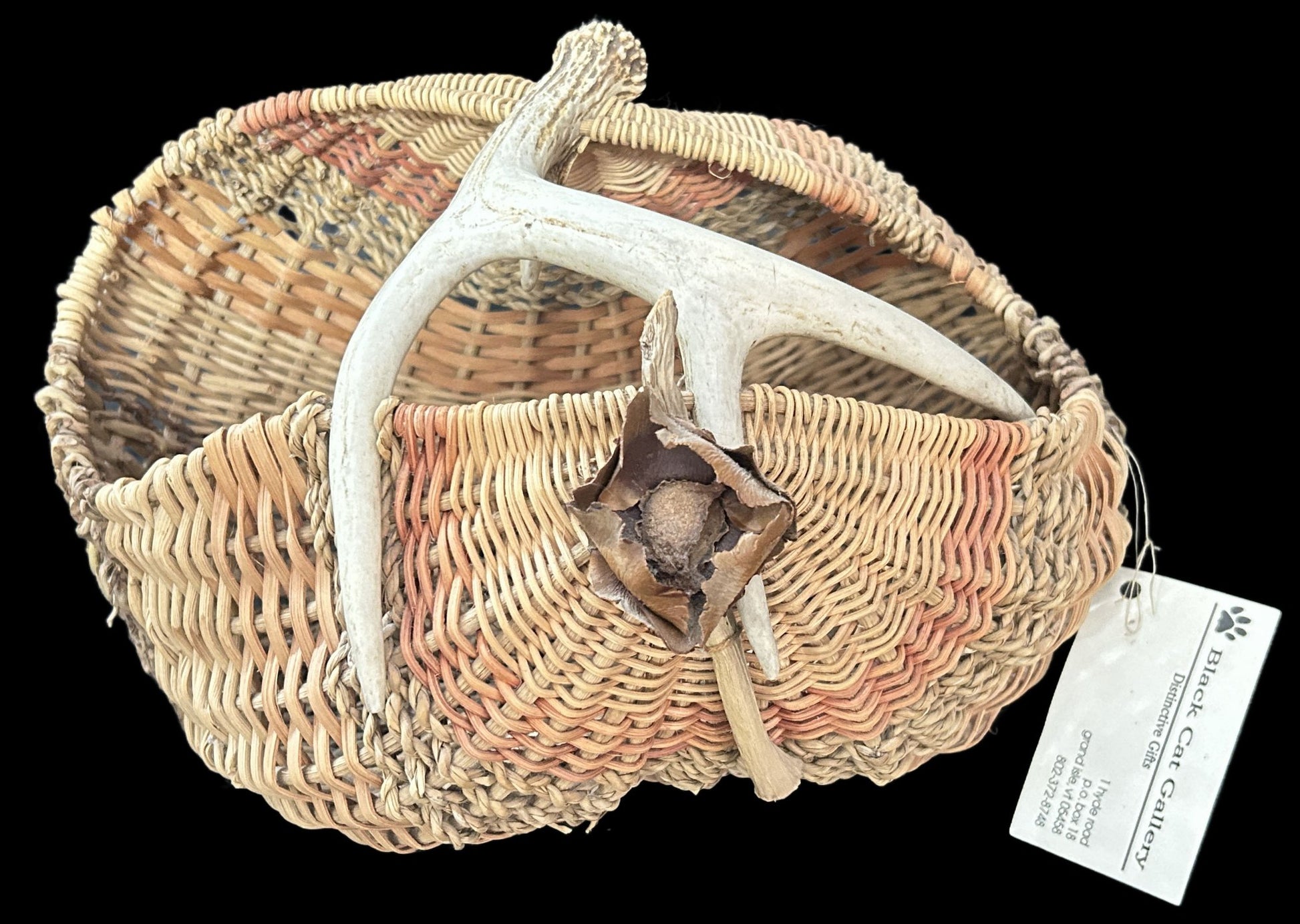 This basket has a tag from Black Cat Gallery, Vermont. It is a wonderful hand woven basket with antler handle.