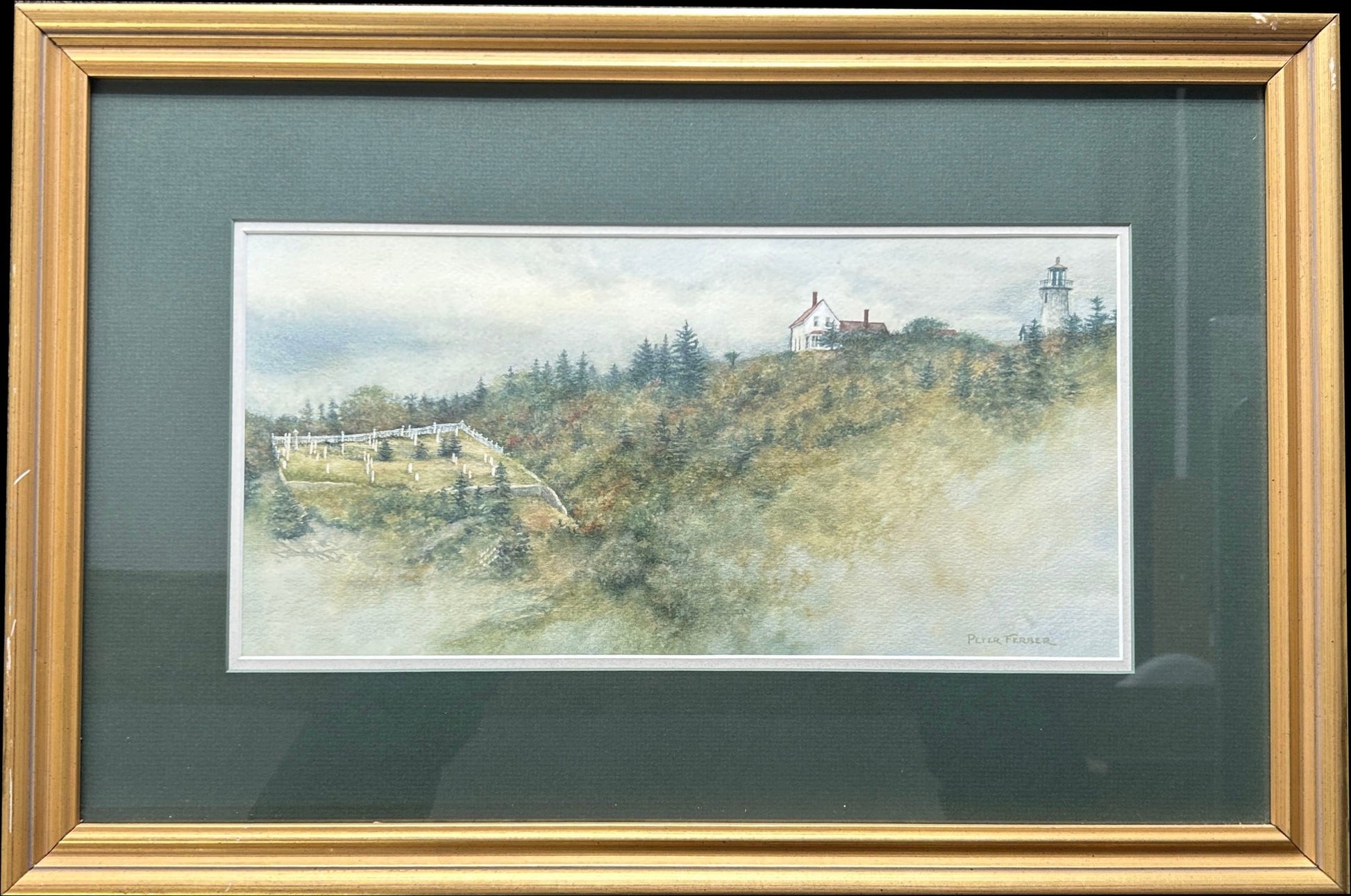 This is an original Peter Ferber watercolor. Peter was an prolific White Mountains artist from Wolfeboro, NH. His original works are highly sought after and this is an unusual piece as it is of the Maine Coast rather than of the White Mountains. It is a lighthouse scene with a graveyard.