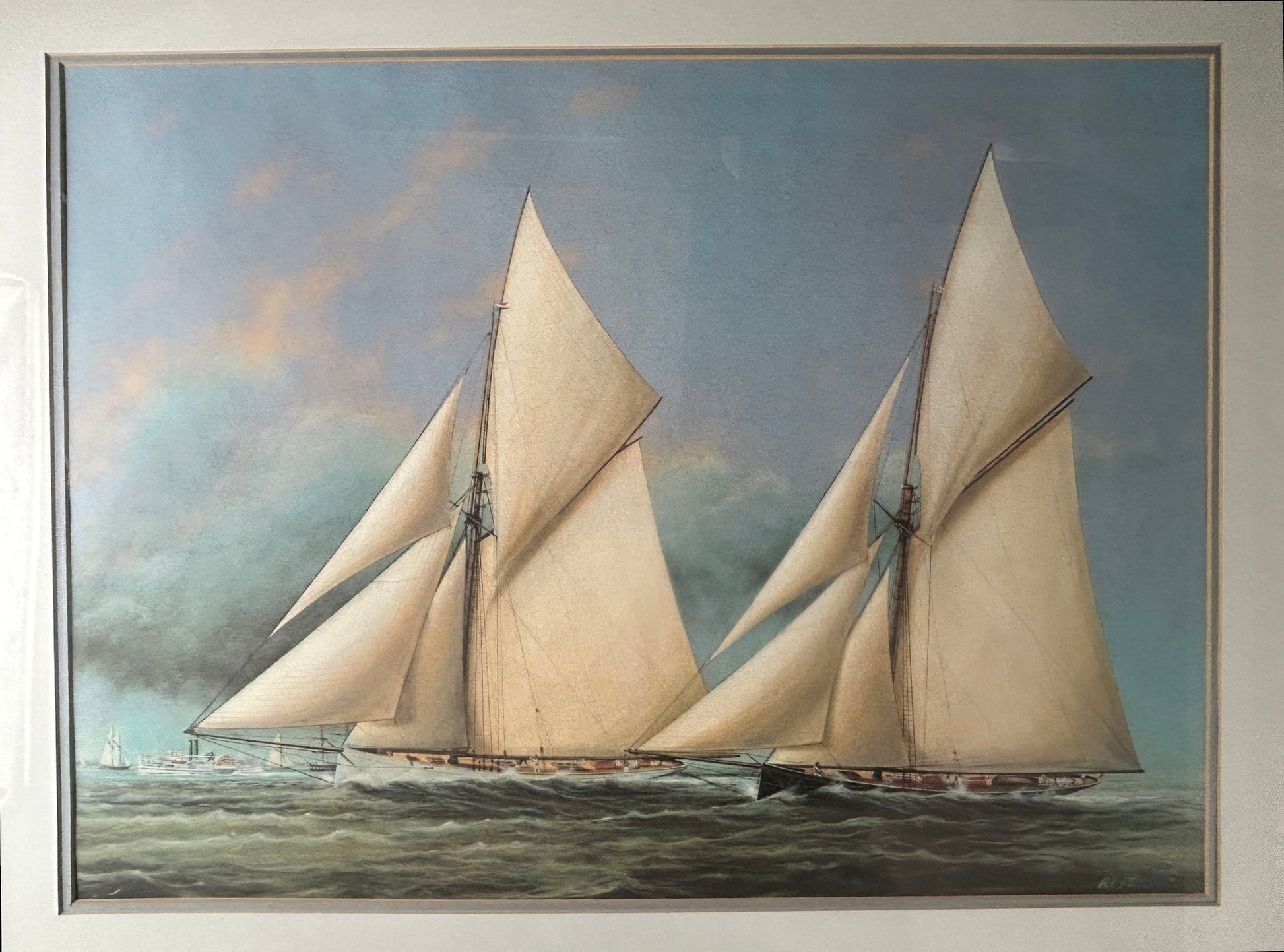 This is a well framed print of two racing yachts.