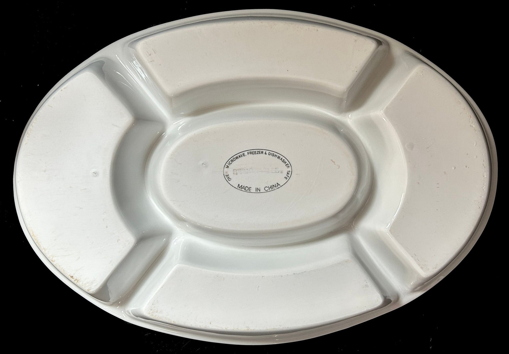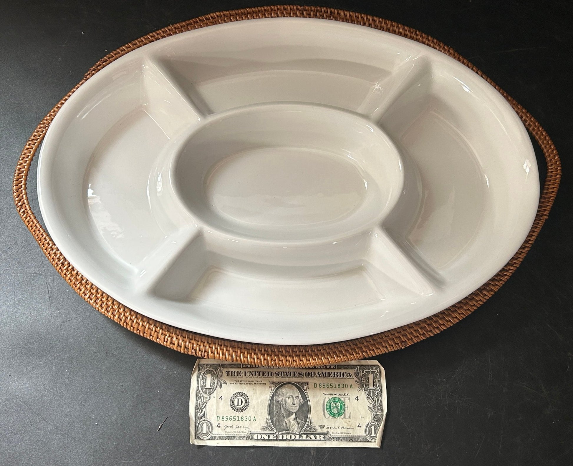 This is a classic white stoneware divided relish dish in an oval woven basket.
