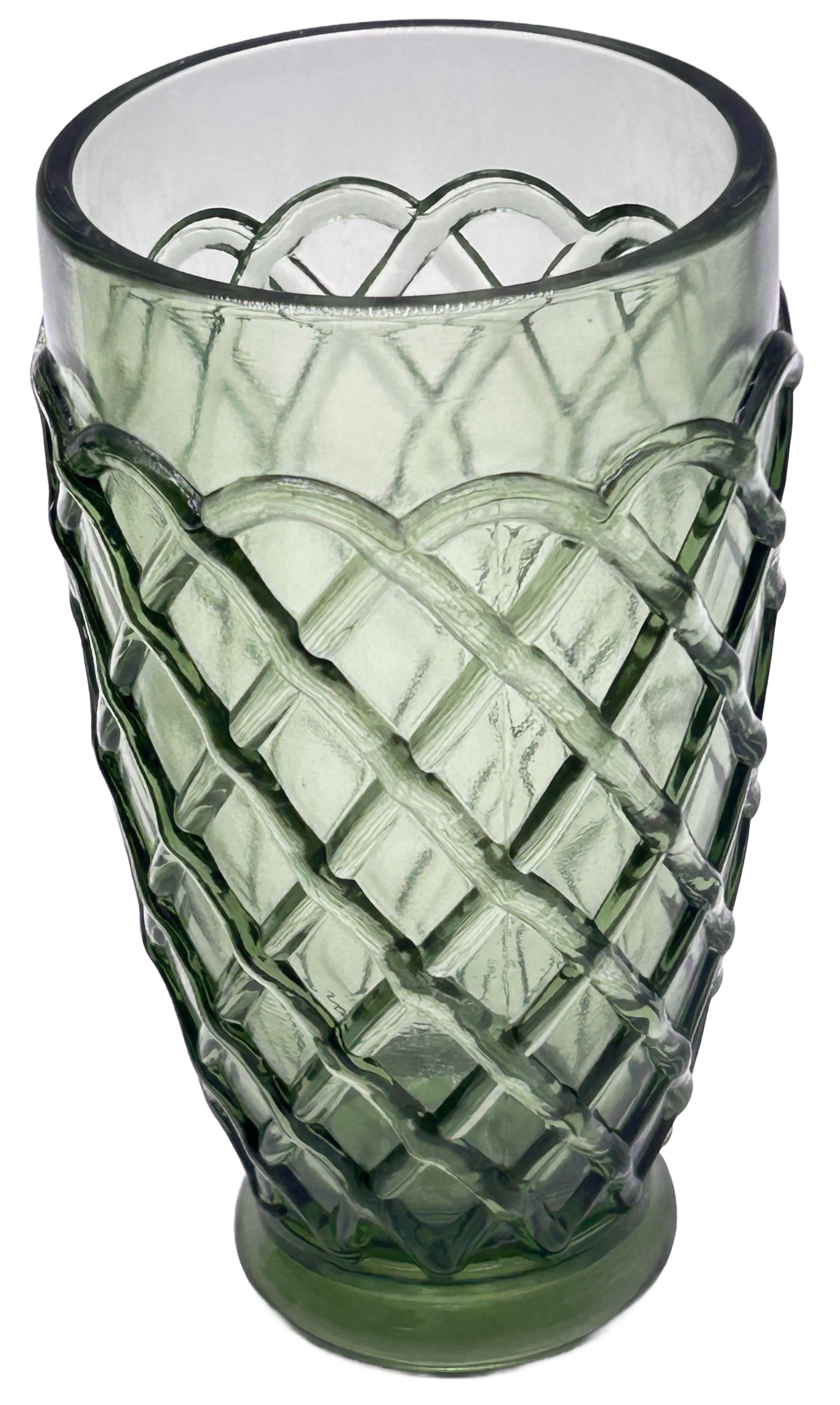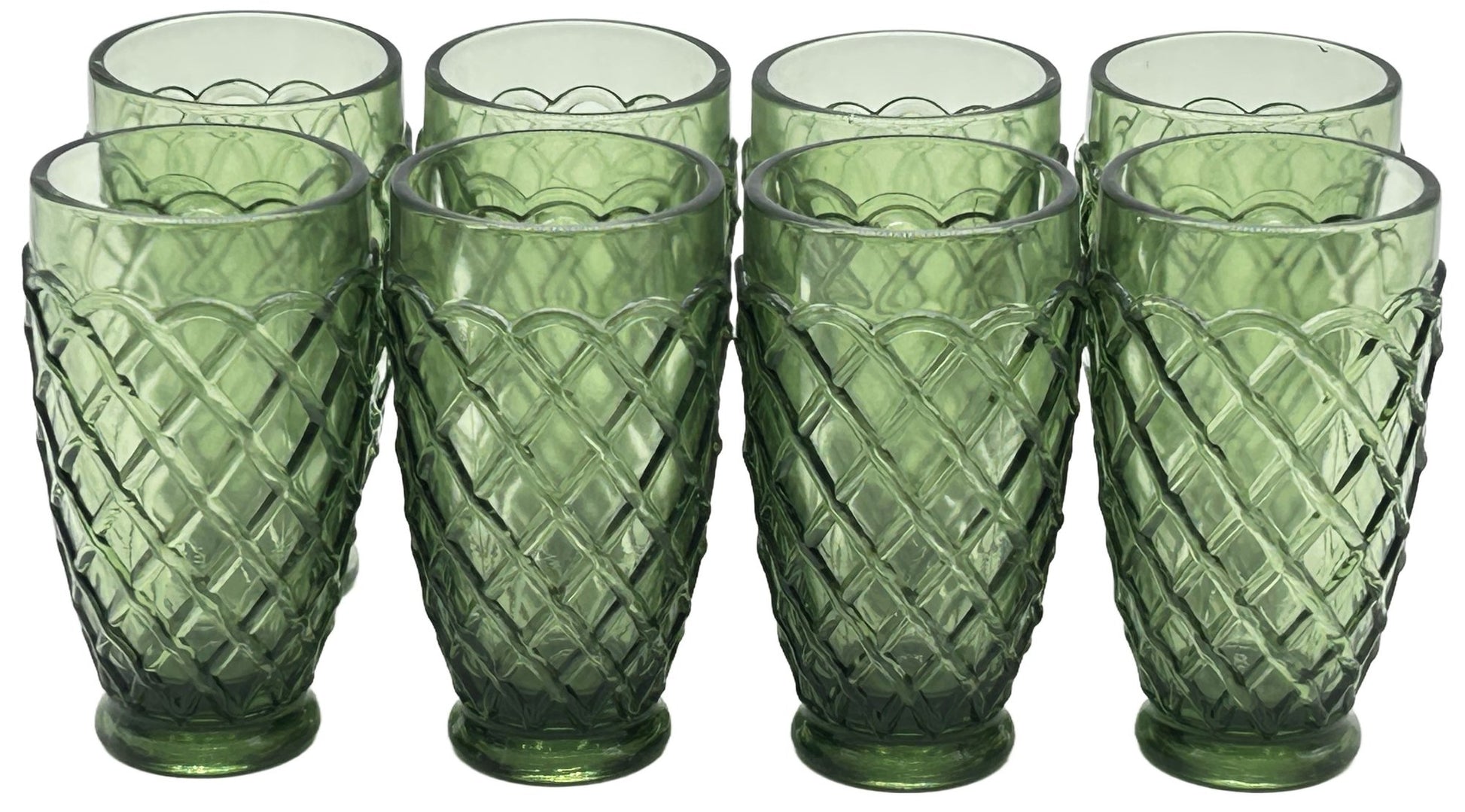 8 pcs vintage MCM avocado green tumblers in trellis design, by LE Smith.