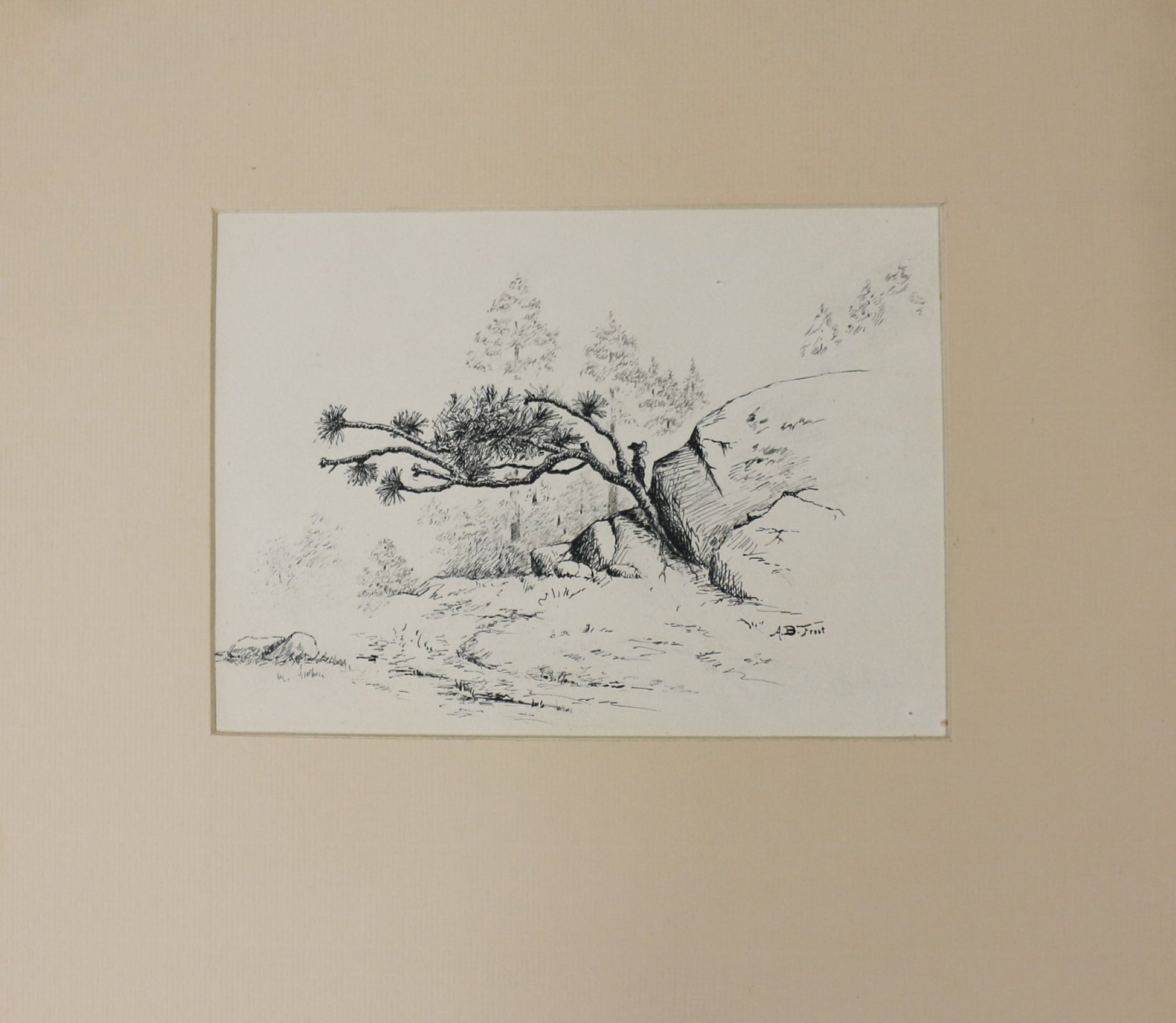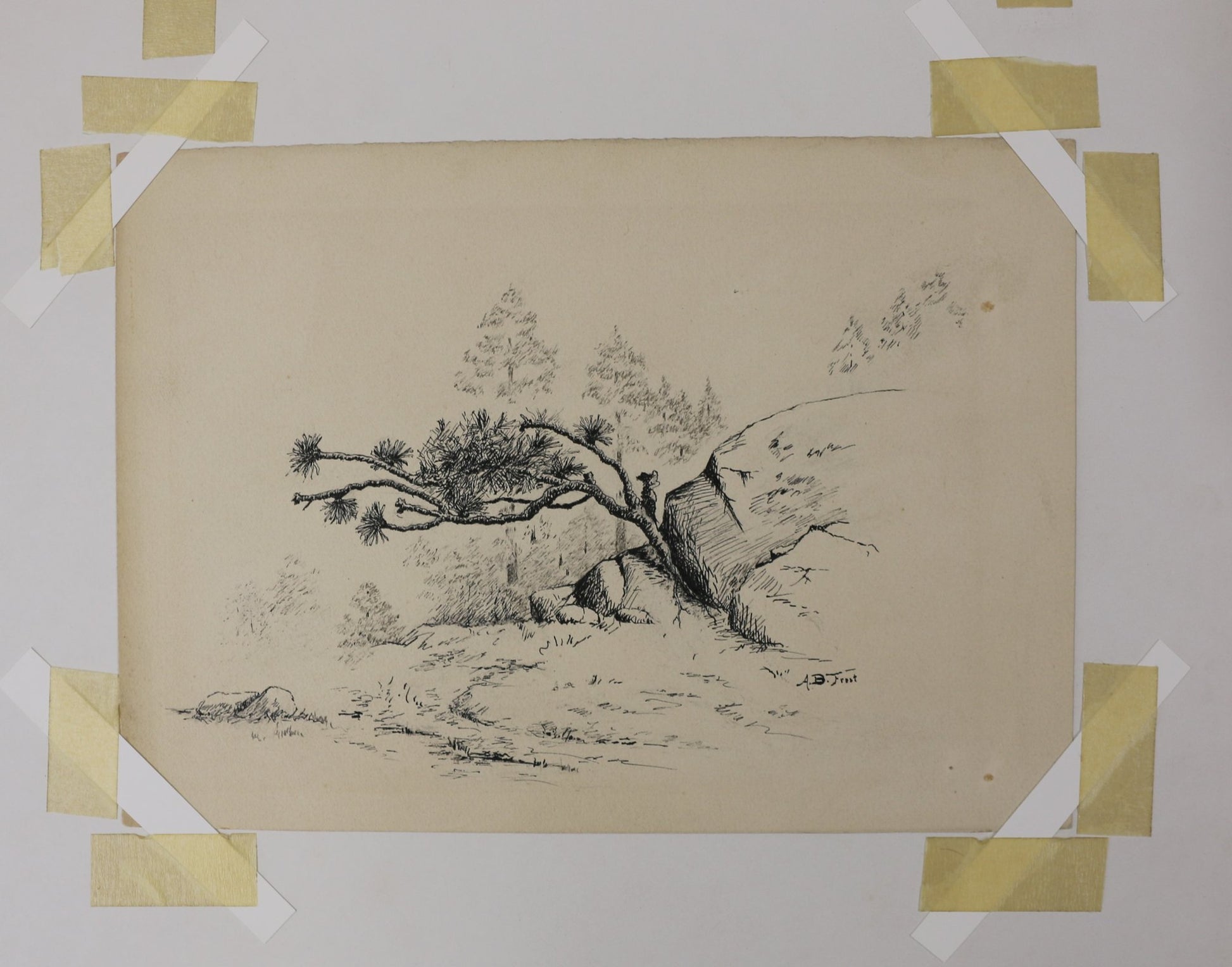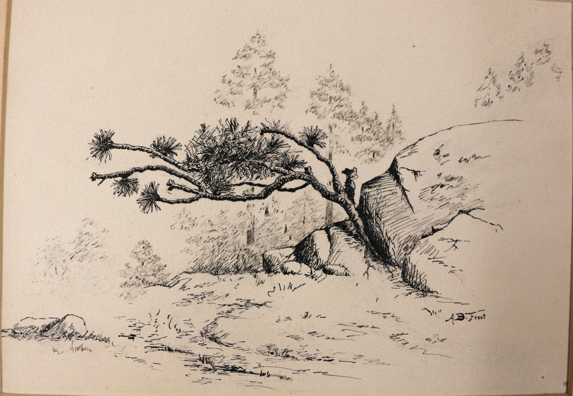 Original pen & ink artwork by A.B. Frost (Arthur Burdett Frost (January 17, 1851 – June 22, 1928). Matted properly under mat. Original image is 6.75" x 9.5". Good condition, two very small spots on the obverse. .